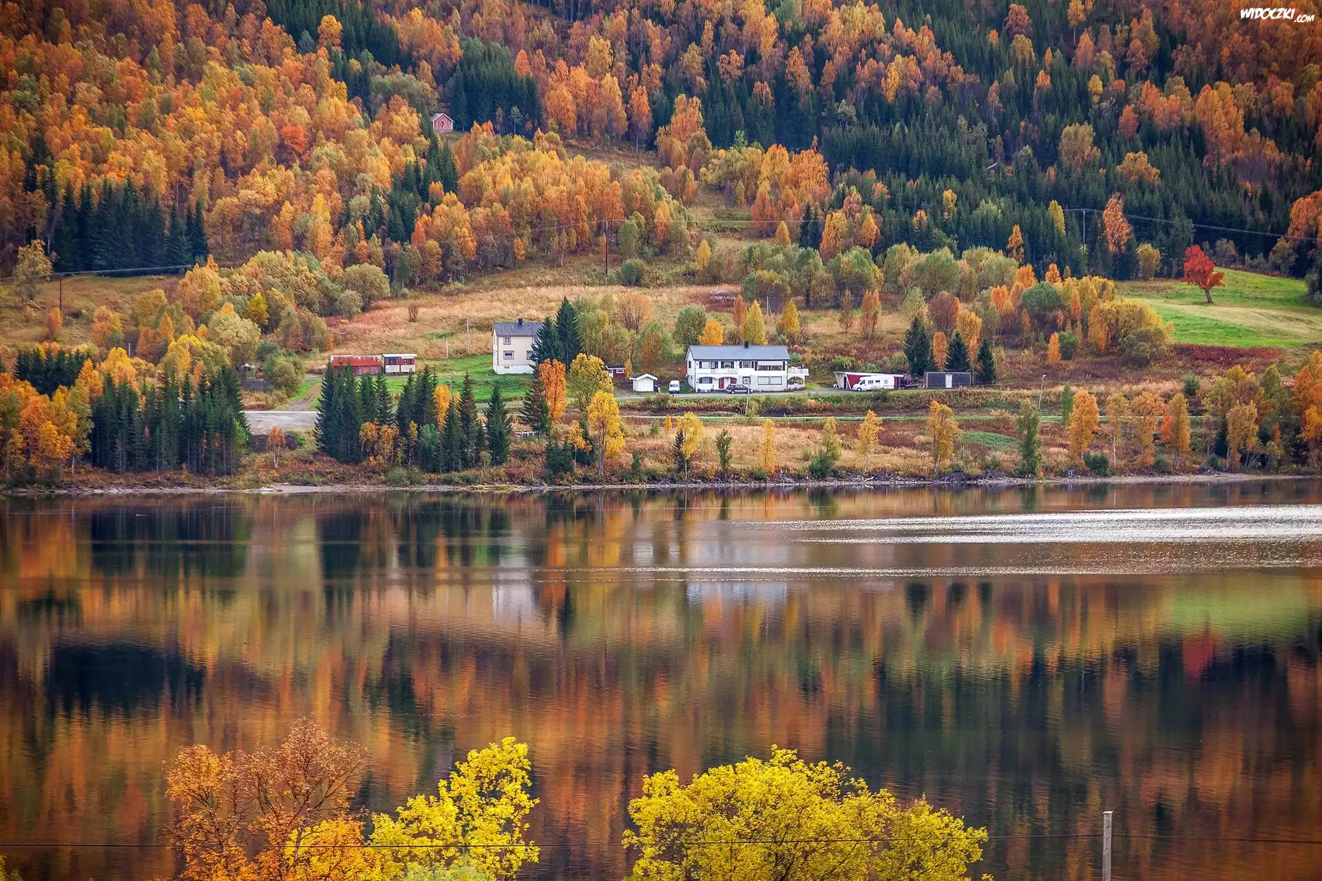 Zdjęcia, Rzeka, Drzewa, Las, Jesień, Domy