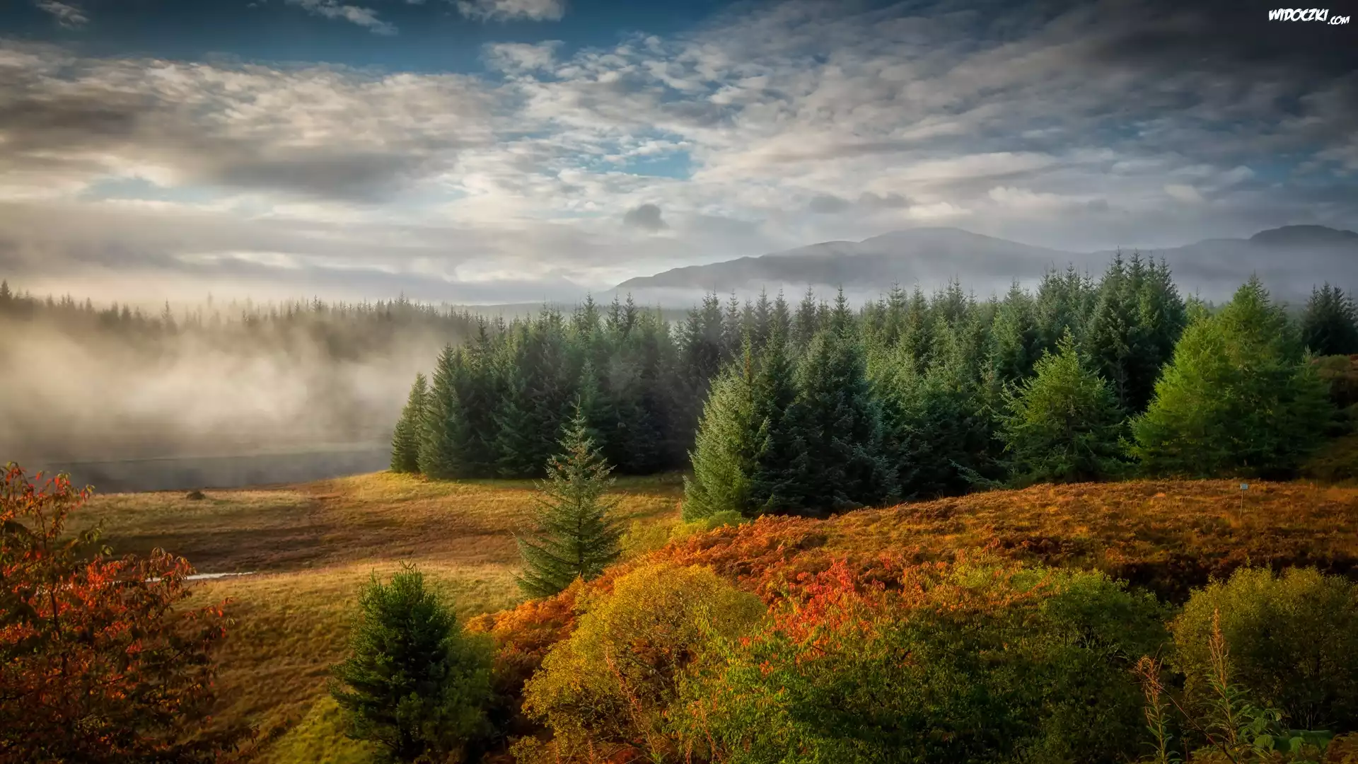 Rzeka, Drzewa, Mgła, Jesień, Góry