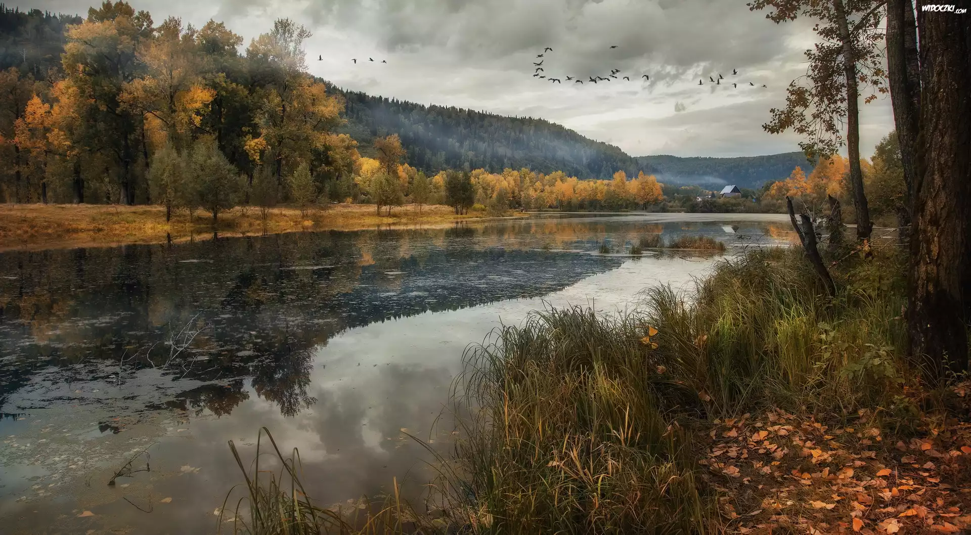 Jesień, Rzeka, Ptaki, Trawa, Drzewa, Liście, Odbicie