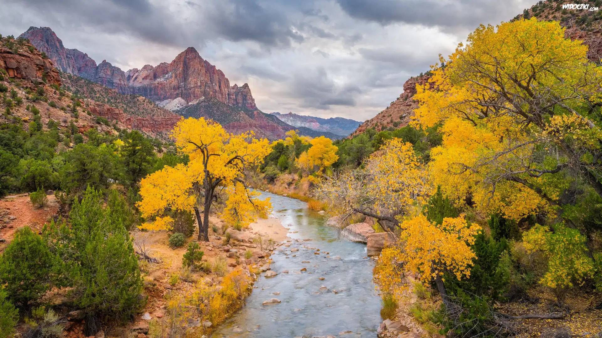 Jesień, Góry, Góra Watchman, Rzeka, Virgin River, Drzewa, Park Narodowy Zion, Utah, Stany Zjednoczone |
