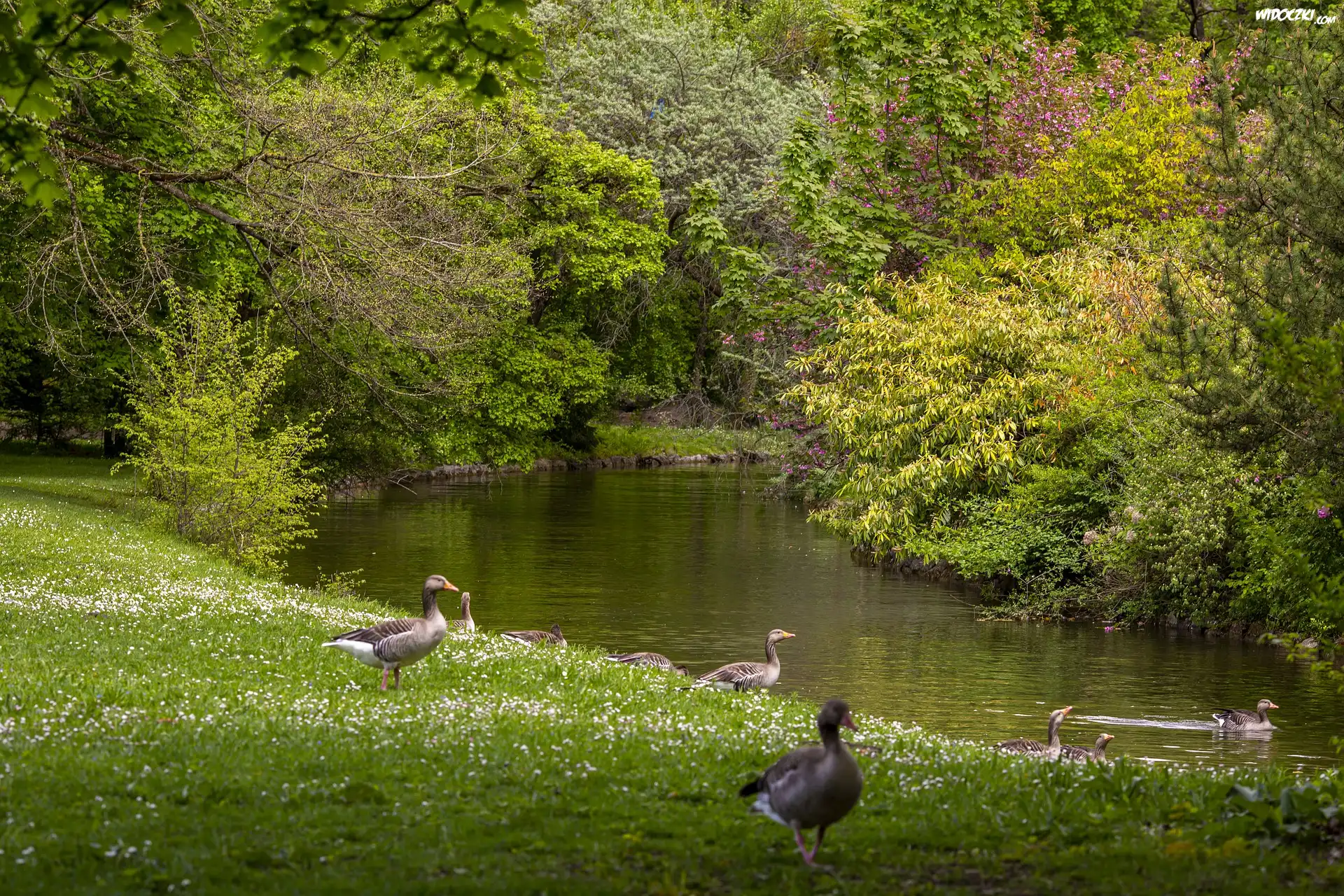 Zdjęcia, Kaczki, Drzewa, Park, Rzeka