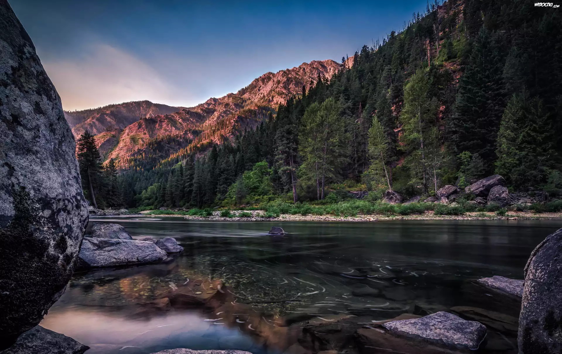 Zdjęcia, Rzeka, Góry, Drzewa, Kamienie, Skały