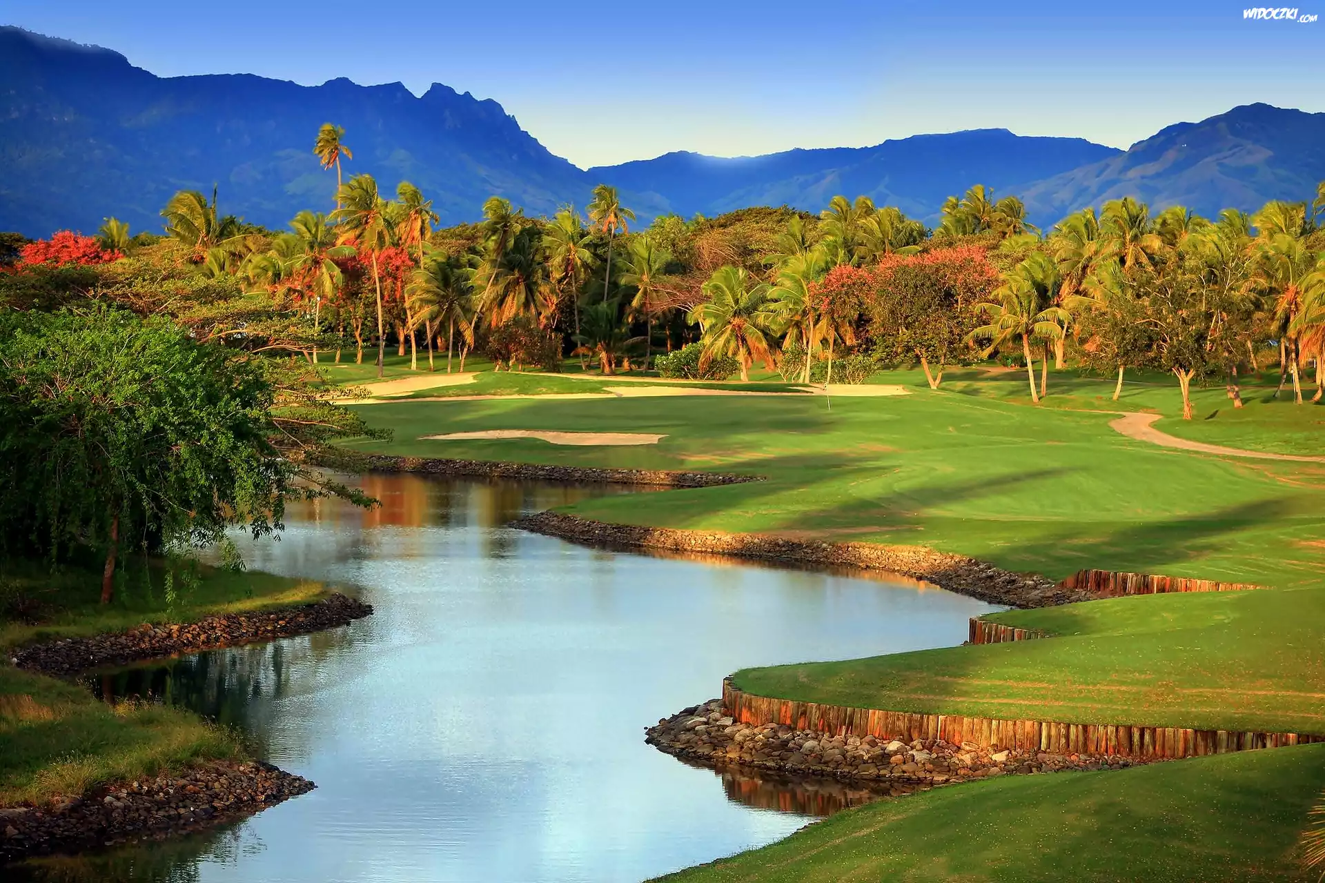 Rzeka, Góry, Drzewa, Trawa, Kamienie, Jesień