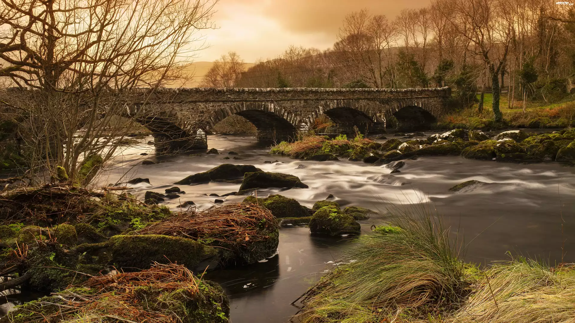 Most, Rzeka, Kamienie, Trawa, Drzewa