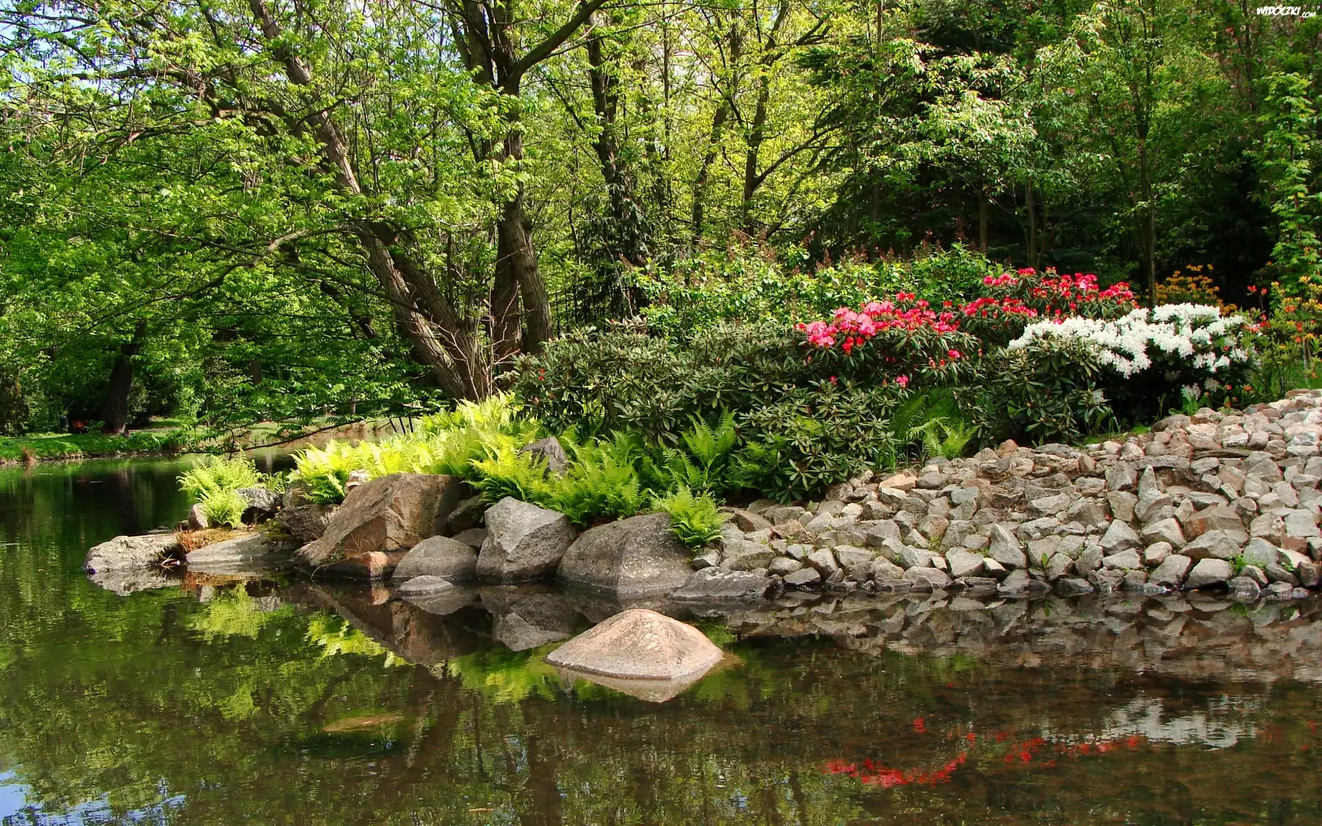 Zdjęcia, Rzeka, Klomb, Kwiaty, Kamienie, Drzewa