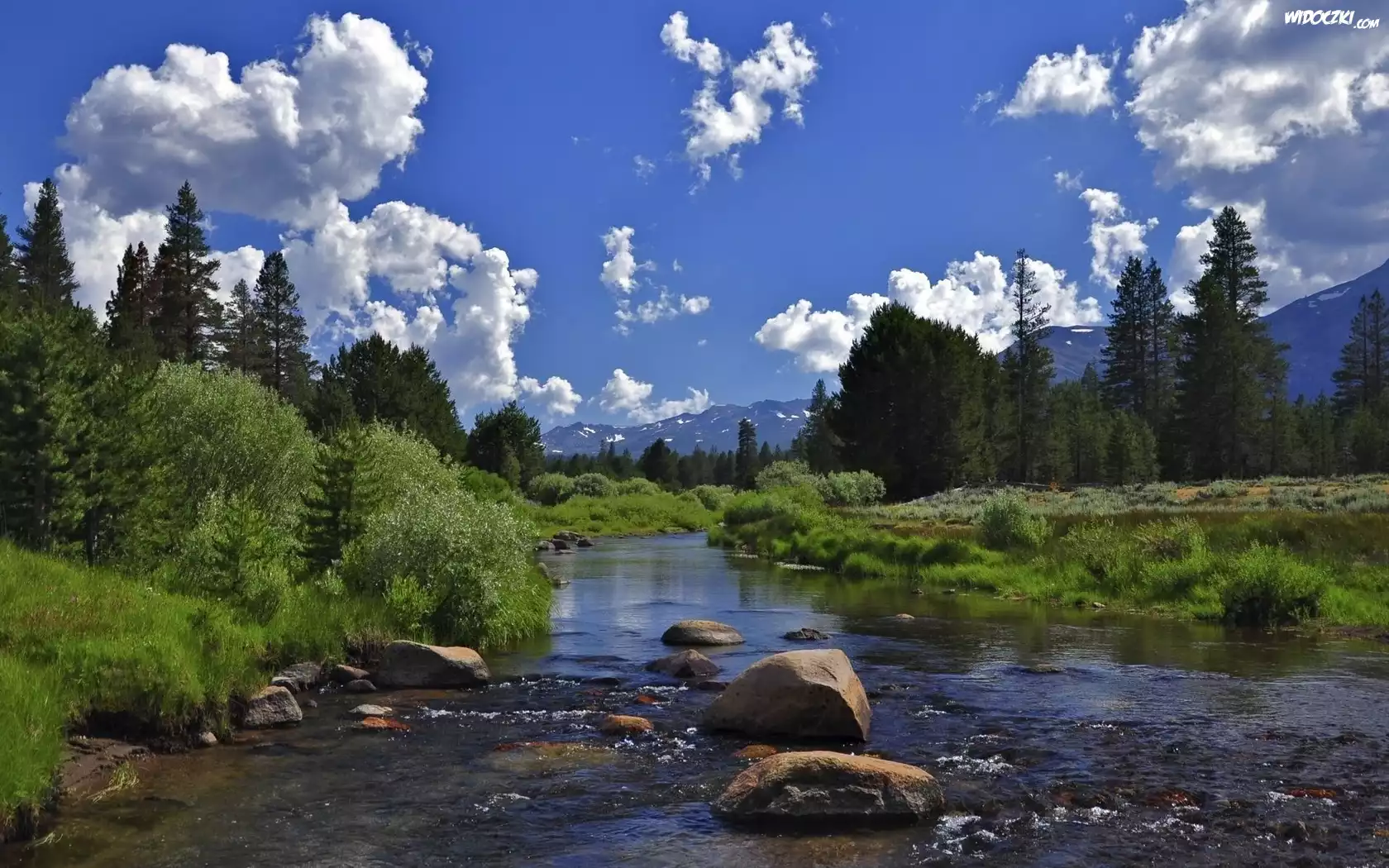Rzeka, Góry, Lasy, Kamienie, Chmury