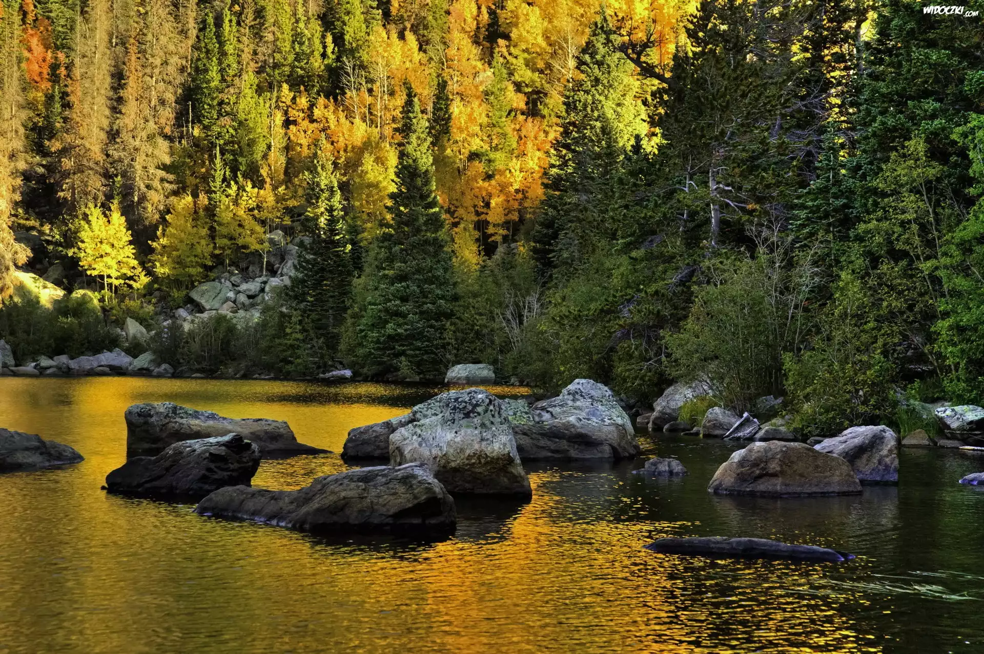 Rzeka, Góry, Lasy, Kamienie, Jesień