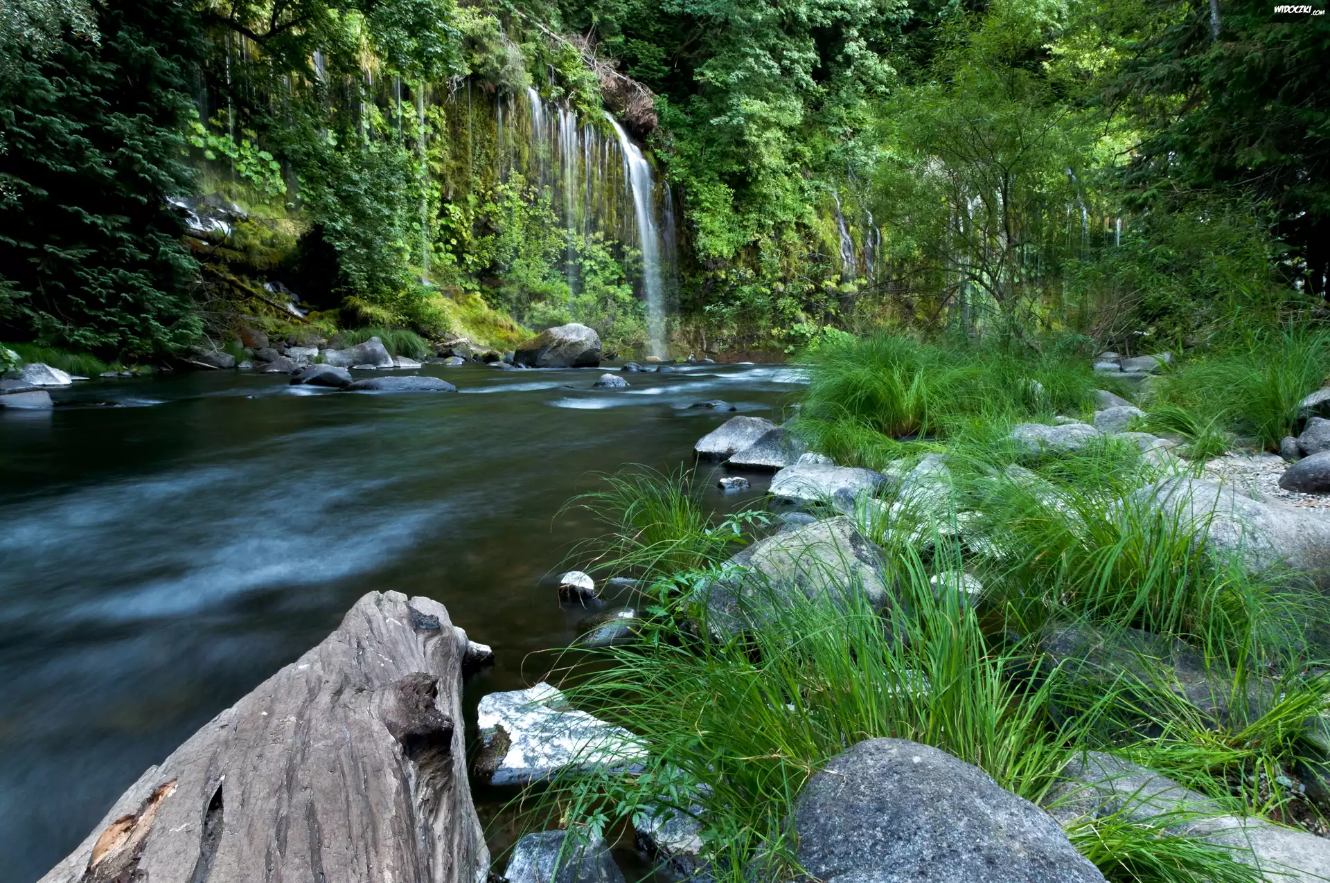 Rzeka, Wodospad, Trawa, Kamienie, Drzewa