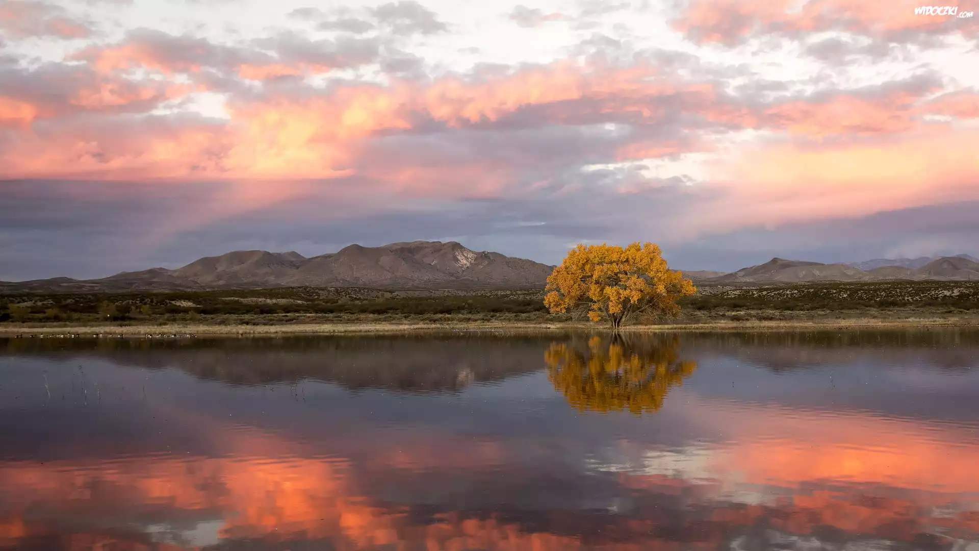 Rzeka Rio Grande, Jesień, Drzewo, Topola kanadyjska, Rezerwat przyrody, Bosque Del Apache, Góry, Wschód słońca, Nowy Meksyk, Stany Zjednoczone |