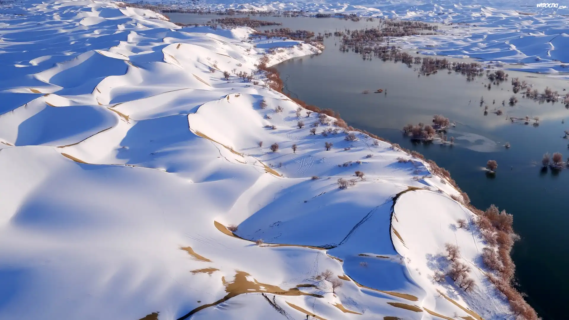 Zdjęcia, Chiny, Kotlina Kaszgarska, Pustynia Takla Makan, Zima, Śnieg, Rzeka