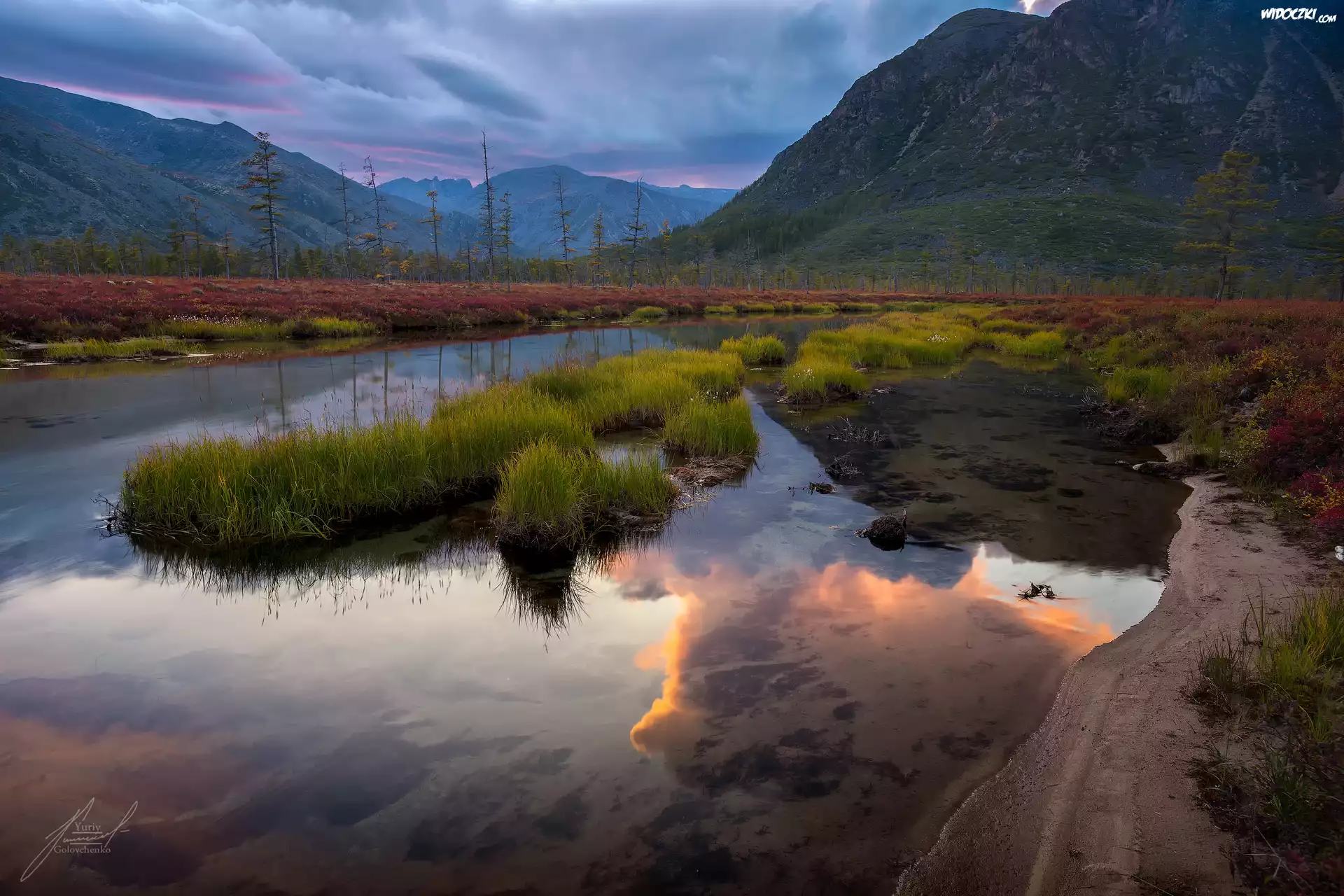 Zdjęcia, Potok Studonyy, Rzeka, Góry Kołymskie, Trawy, Drzewa, Kołyma, Obwód magadański, Rosja