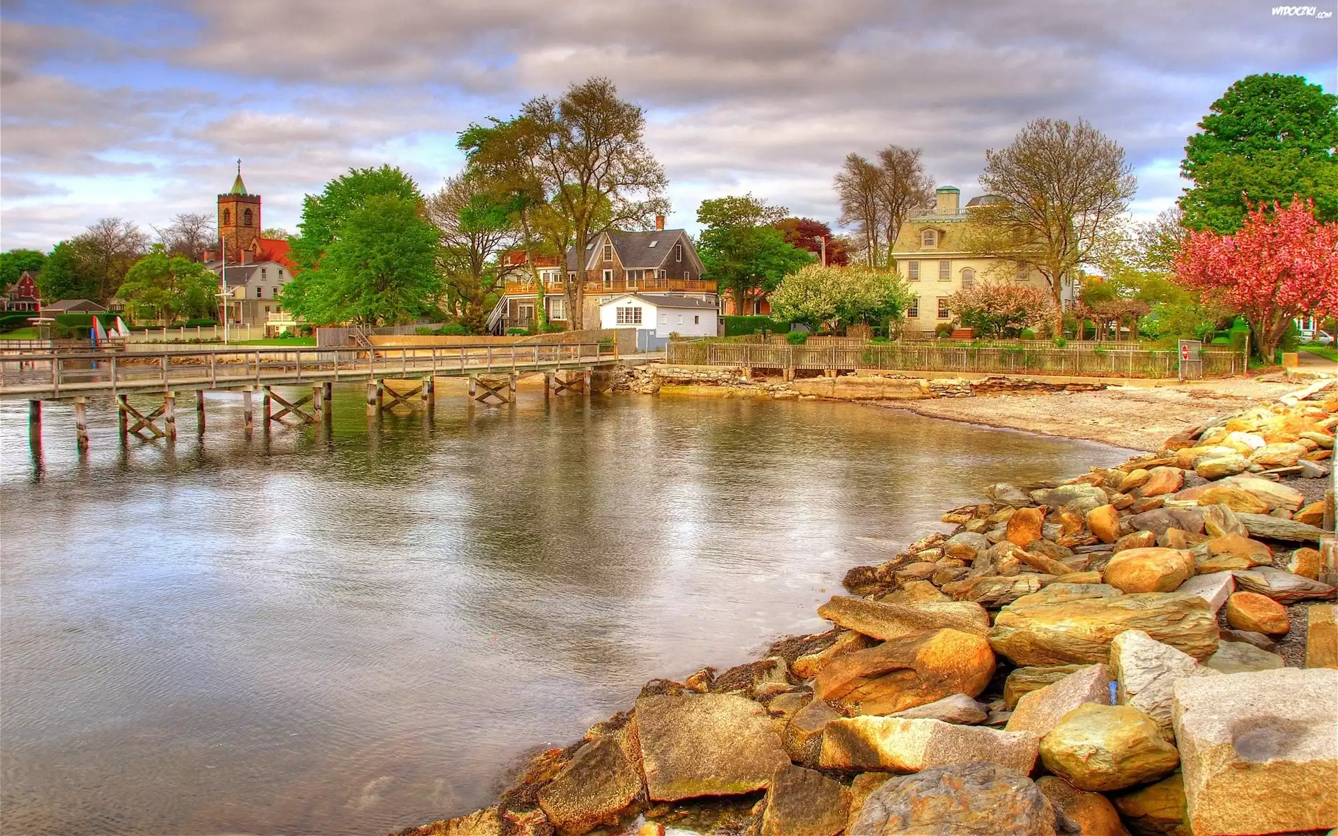 Zdjęcia, Rzeka, Kamienie, Domy, Kościół, Drzewa