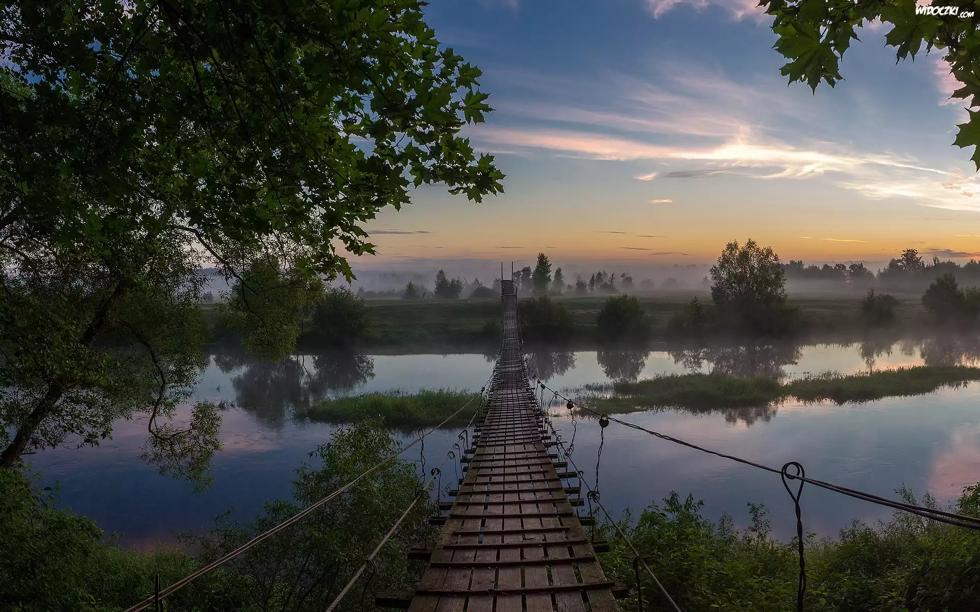 Zdjęcia, Rzeka, Most, Mgła, Drzewa, Krzewy, Poranek