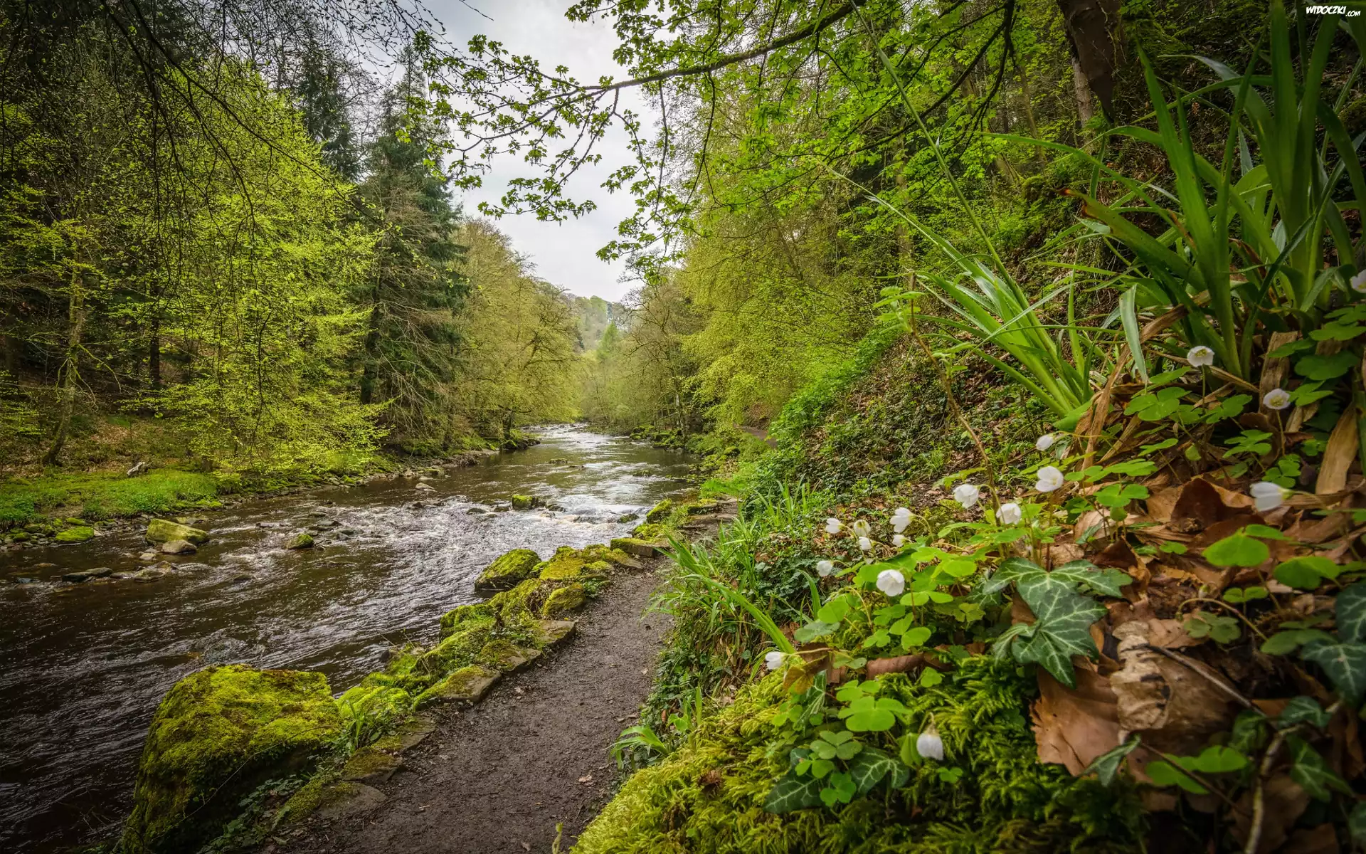 Zdjęcia, Rzeka, Las, Drzewa, Ścieżka, Kwiaty, Wiosna