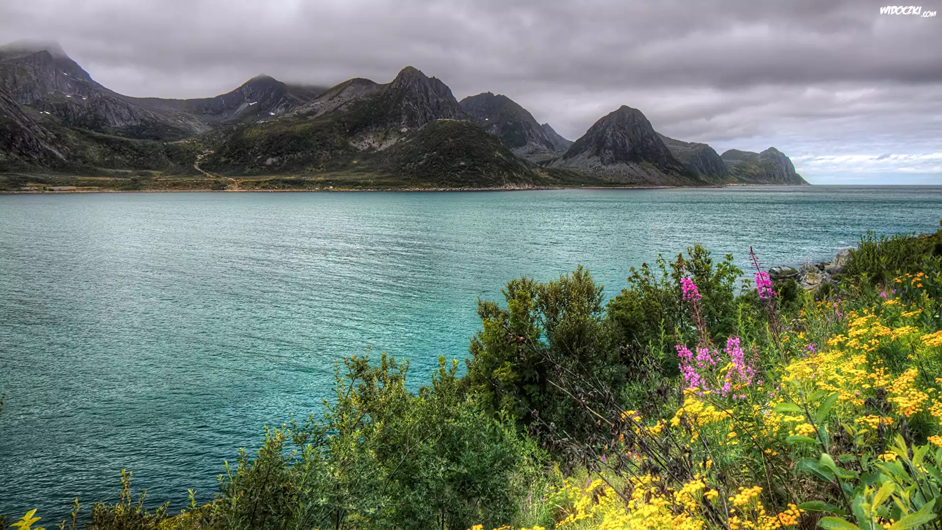 Zdjęcia, Rzeka, Góry, Krzewy, Kwiaty, Chmury
