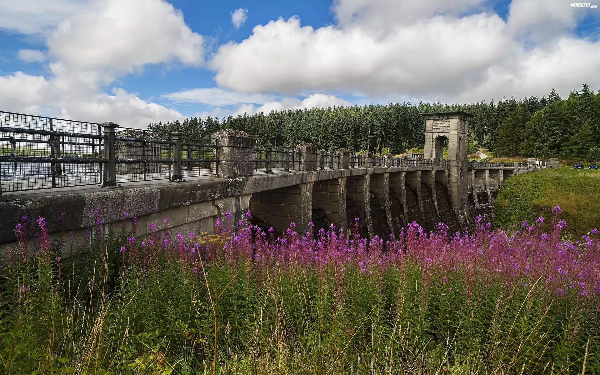 Zdjęcia, Rzeka, Las, Kwiaty, Tama