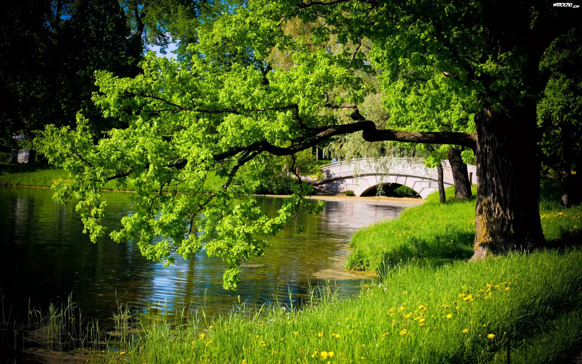 Rzeka, Mostek, Park, Kwiaty, Wiosna