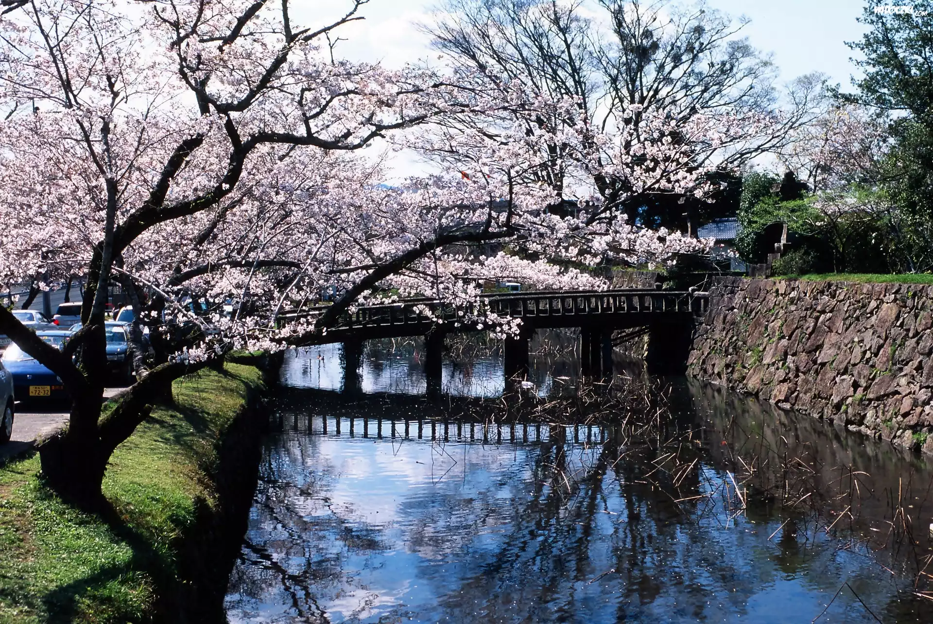 Zdjęcia, Rzeka, Mostek, Kwitnące, Drzewa