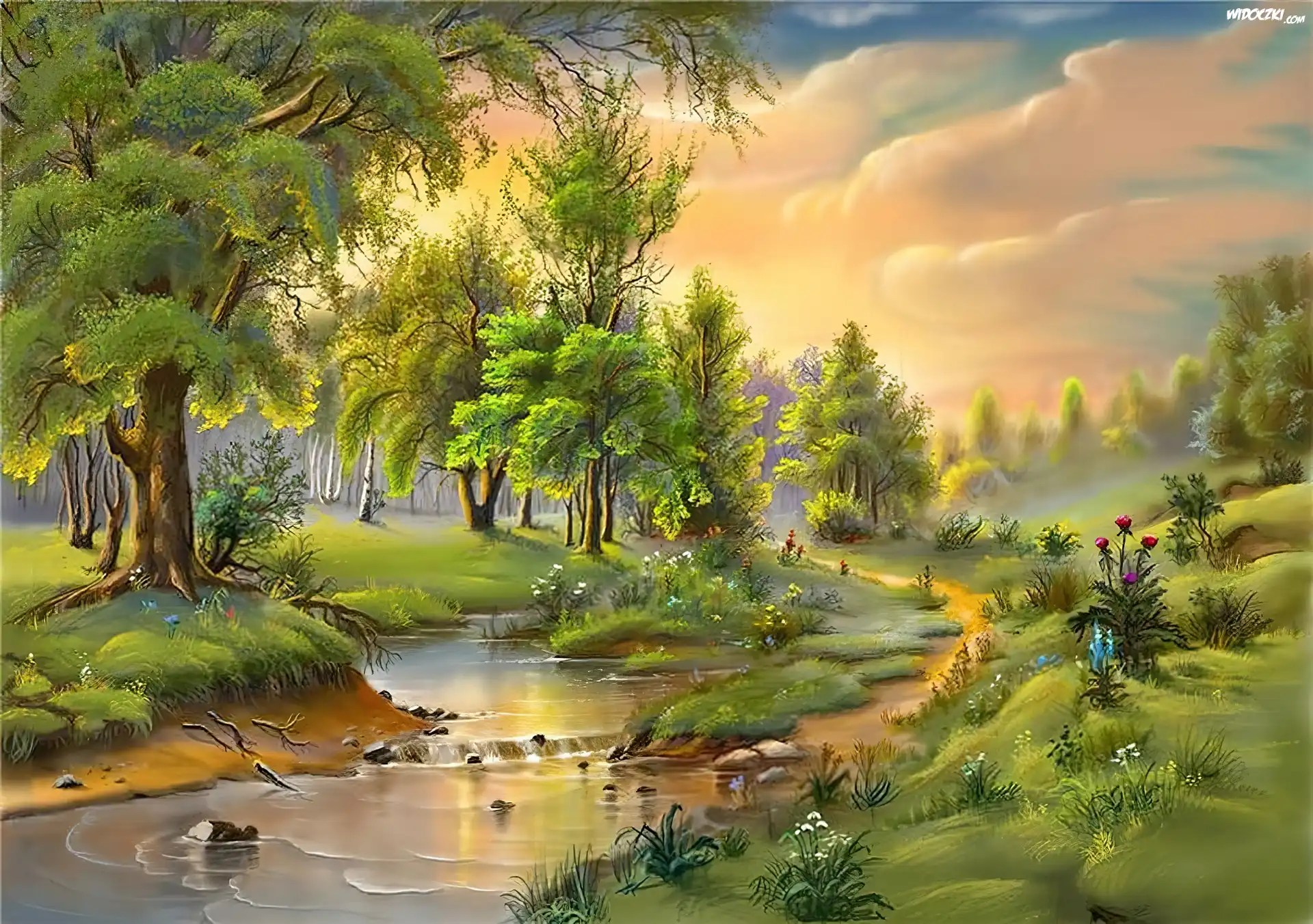 Jesień, Droga, Drzewa Góra, Rzeki Las, Przechodzące Światło Jesień, Paprocie Prosta, Droga Czerwone, Domki, Wąska, Rzeczka Góra, Rzeki Góry, Potok, Kamienie Las, Rzeka, Zachód, Słońca, Czółno Aleja, Dębowa Las, Przenikające swiatło Złote, Pole, Droga Zielone, Lasy, Rozległe, Jeziora, Chmurki Góry, Las, Domki Zielony, Las, Rzeka