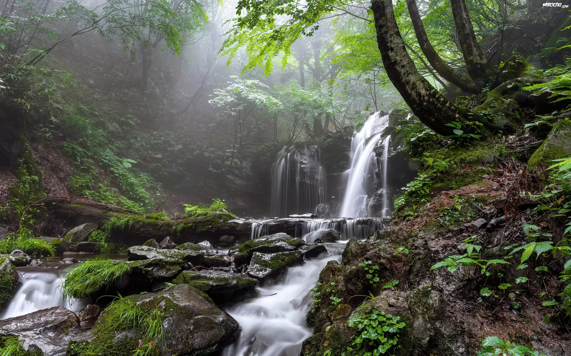 Zdjęcia, Las, Rzeka, Wodospad, Skały, Kamienie, Rośliny, Drzewa