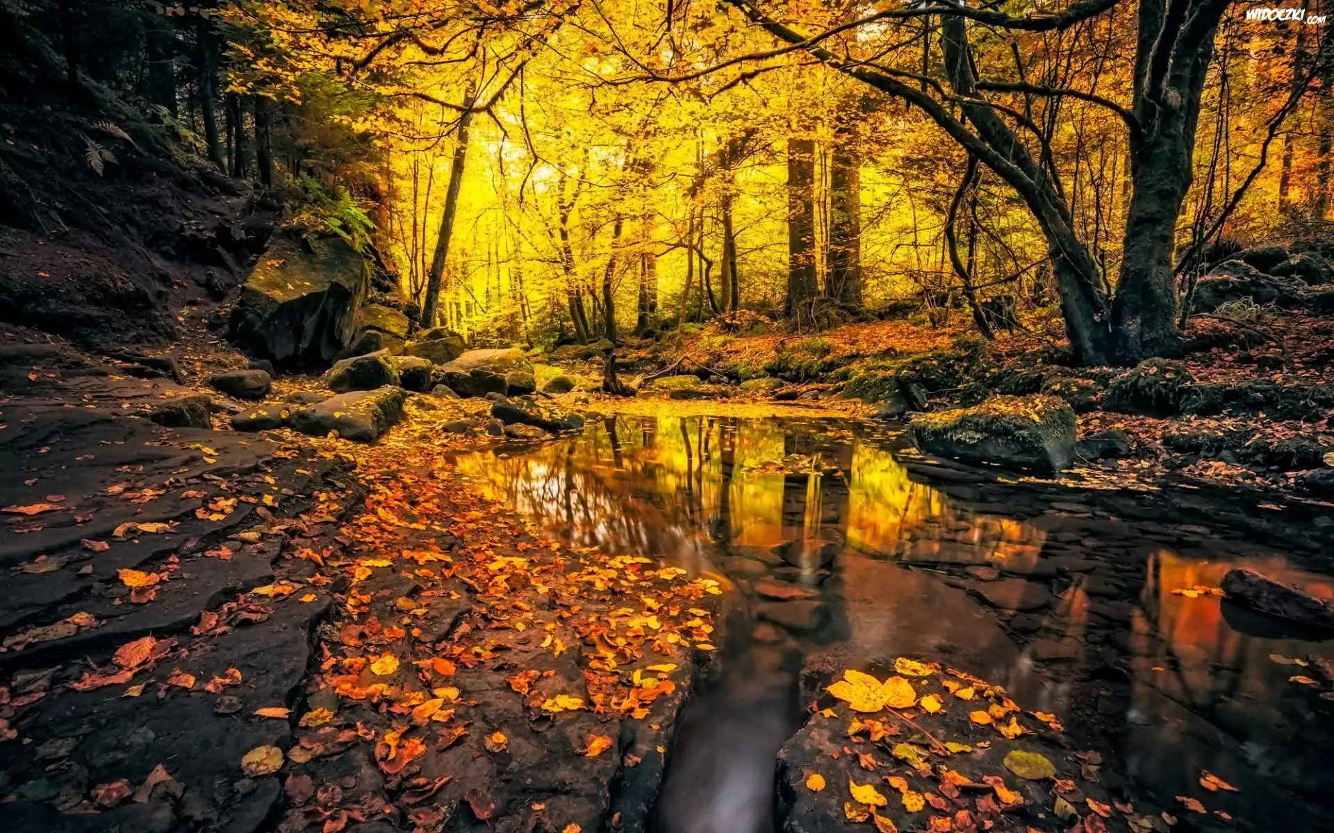 Zdjęcia, Las, Rzeka, Kamienie, Liście, Przebijające, Światło, Jesień