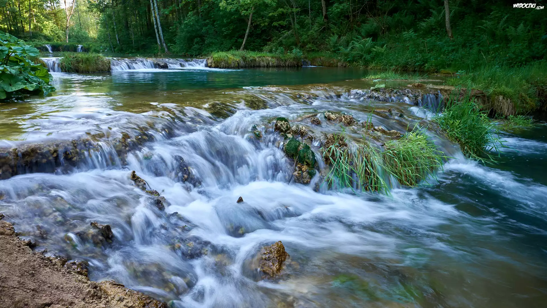 Zdjęcia, Kaskada, Rzeka, Las, Roślinność, Kamienie