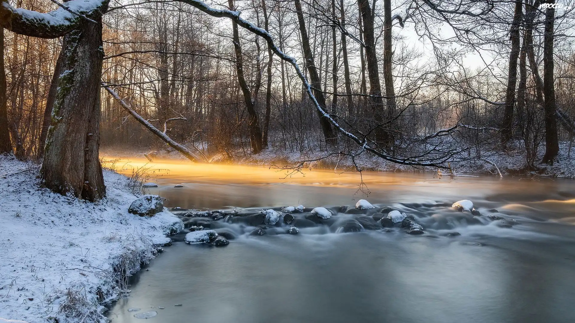 Zima, Rzeka, Las, Drzewa, Krzewy