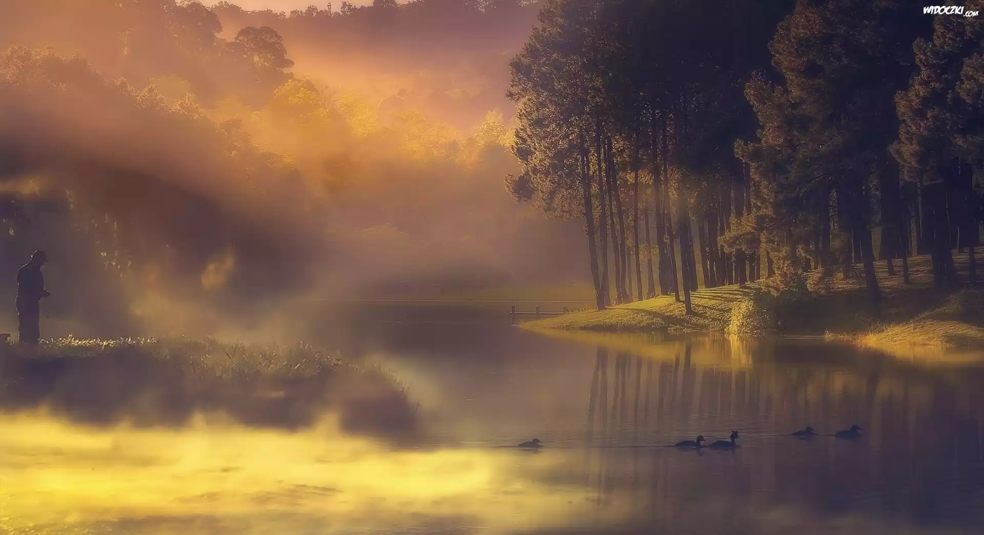Zdjęcia, Rzeka, Mgła, Poranek, Las, Kaczki
