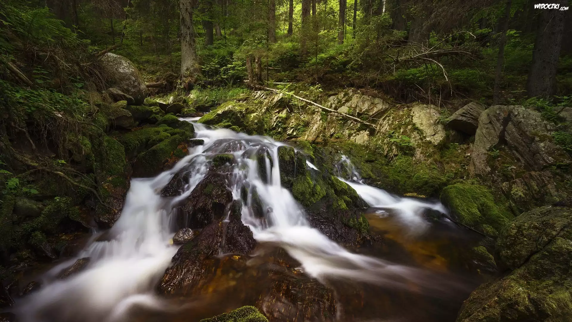 Zdjęcia, Las, Drzewa, Skały, Rzeka