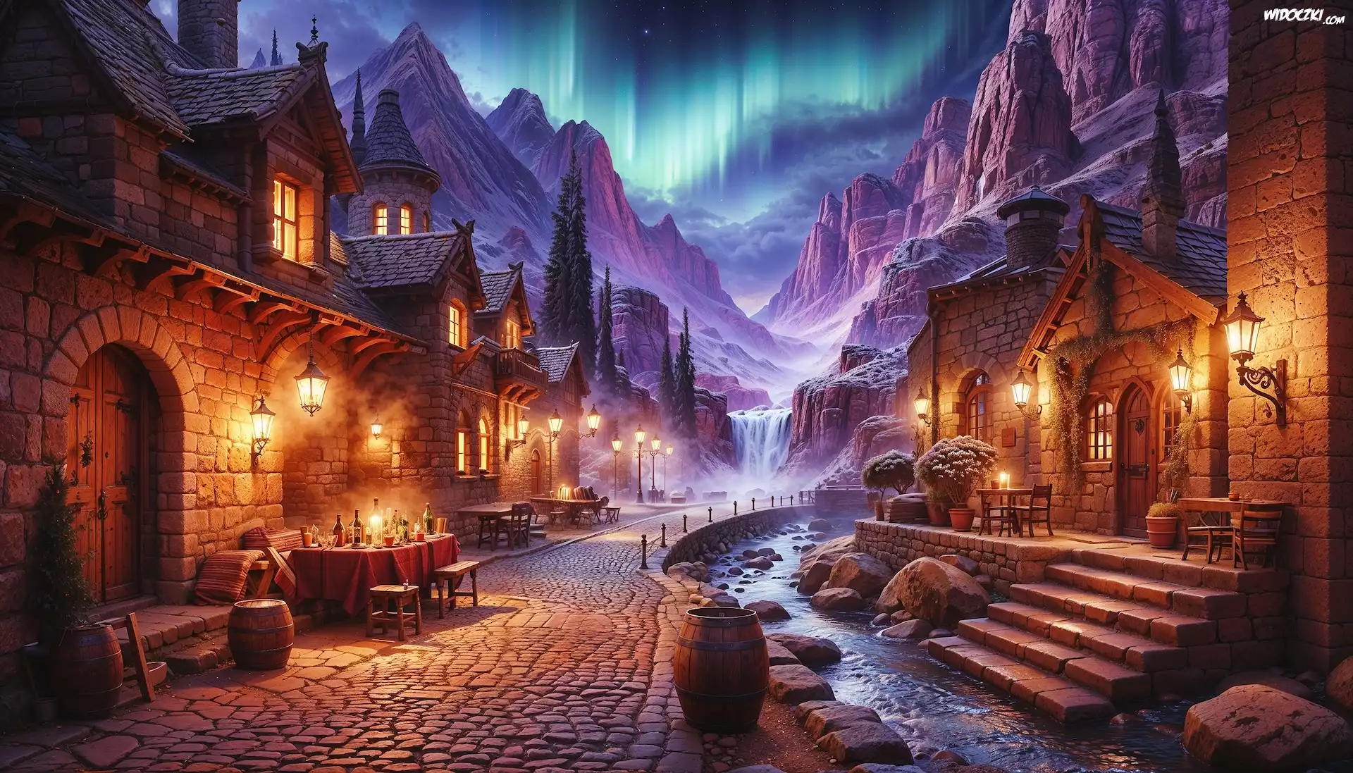 Zdjęcia, Grafika, Domy, Latarnie, Rzeka, Zorza polarna, Góry