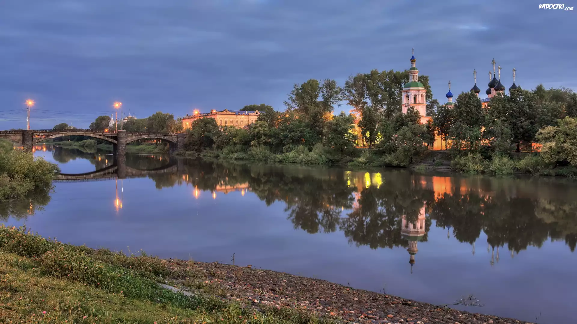Rzeka Wołogda, Most, Latarnie, Poranek, Drzewa, Cerkiew Objawienia Pańskiego, Wołogda, Obwód wołogodzki, Rosja |