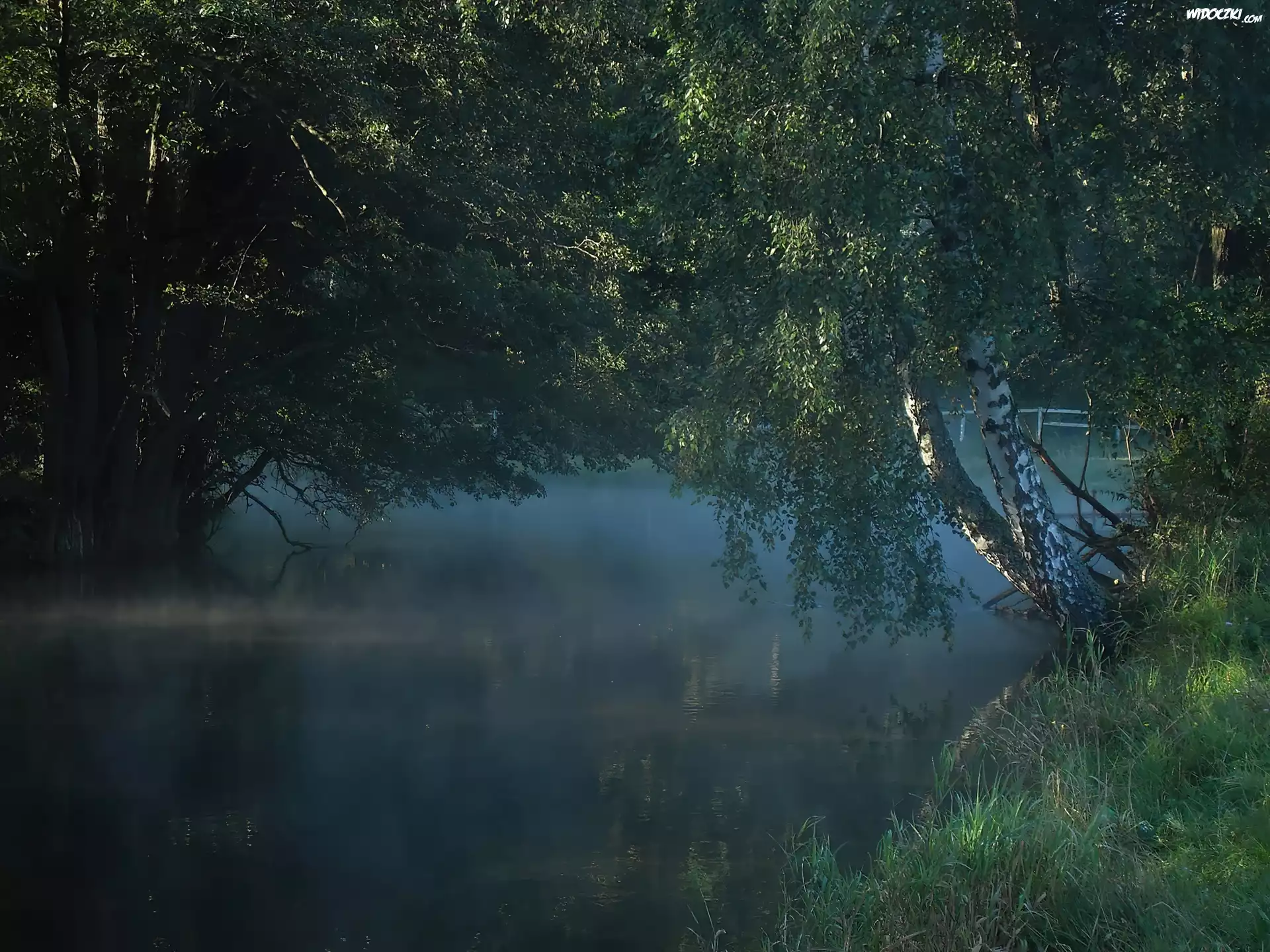 Zdjęcia, Rzeka, Mgła, Brzoza, Liście, Trawa