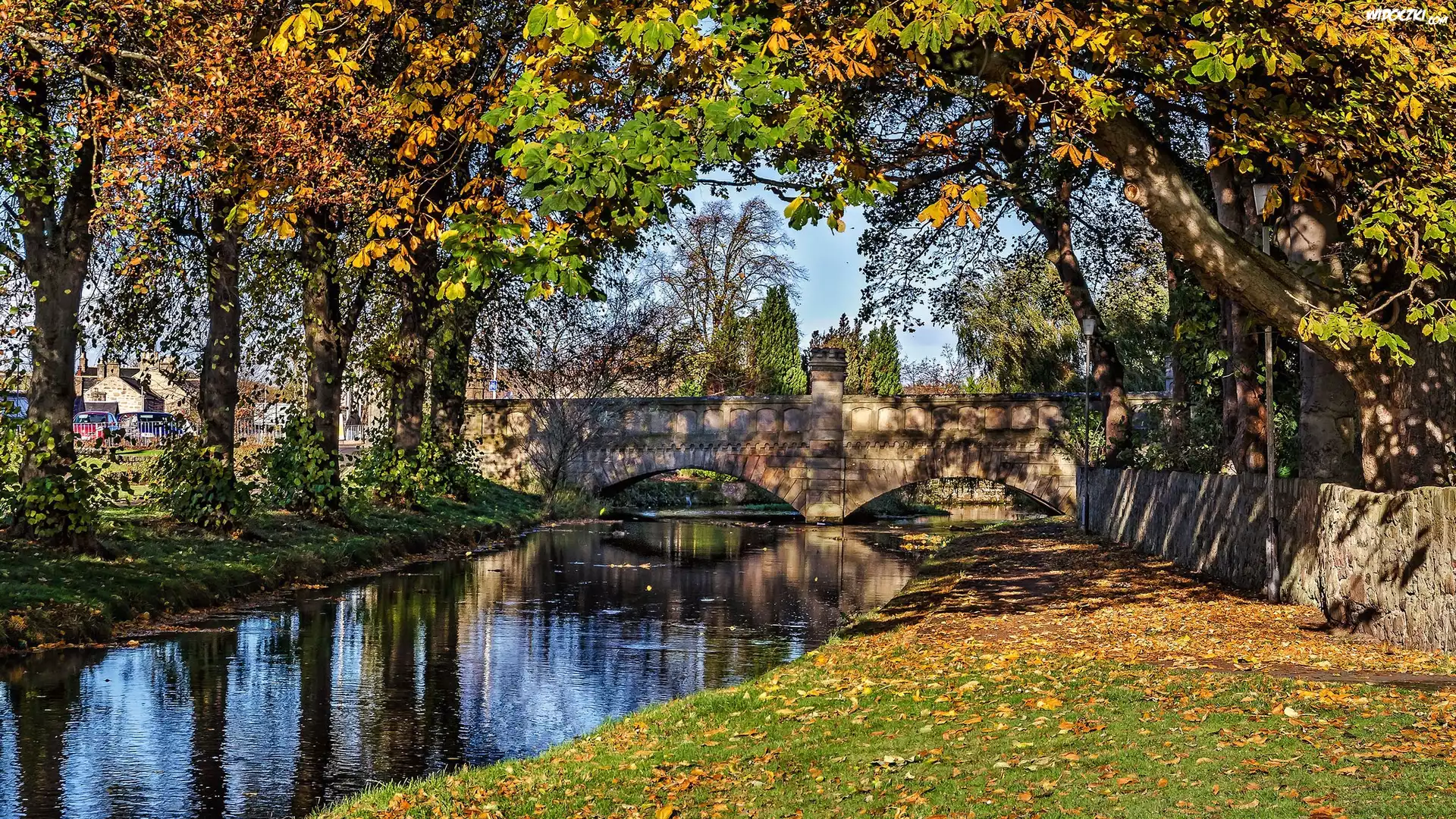 Zdjęcia, Rzeka, Most, Drzewa, Liście, Jesień