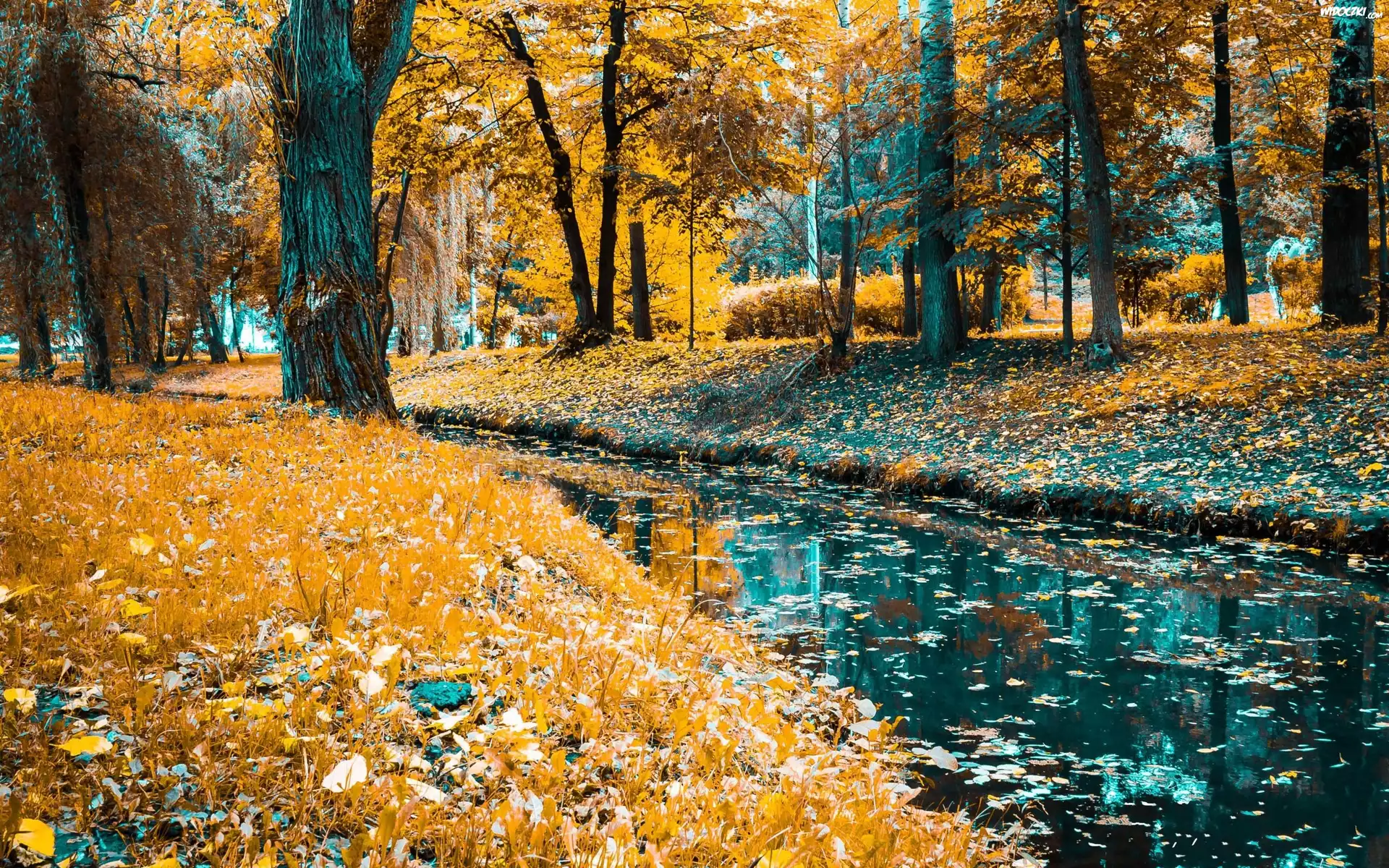 Zdjęcia, Rzeka, Park, Drzewa, Liście, Jesień