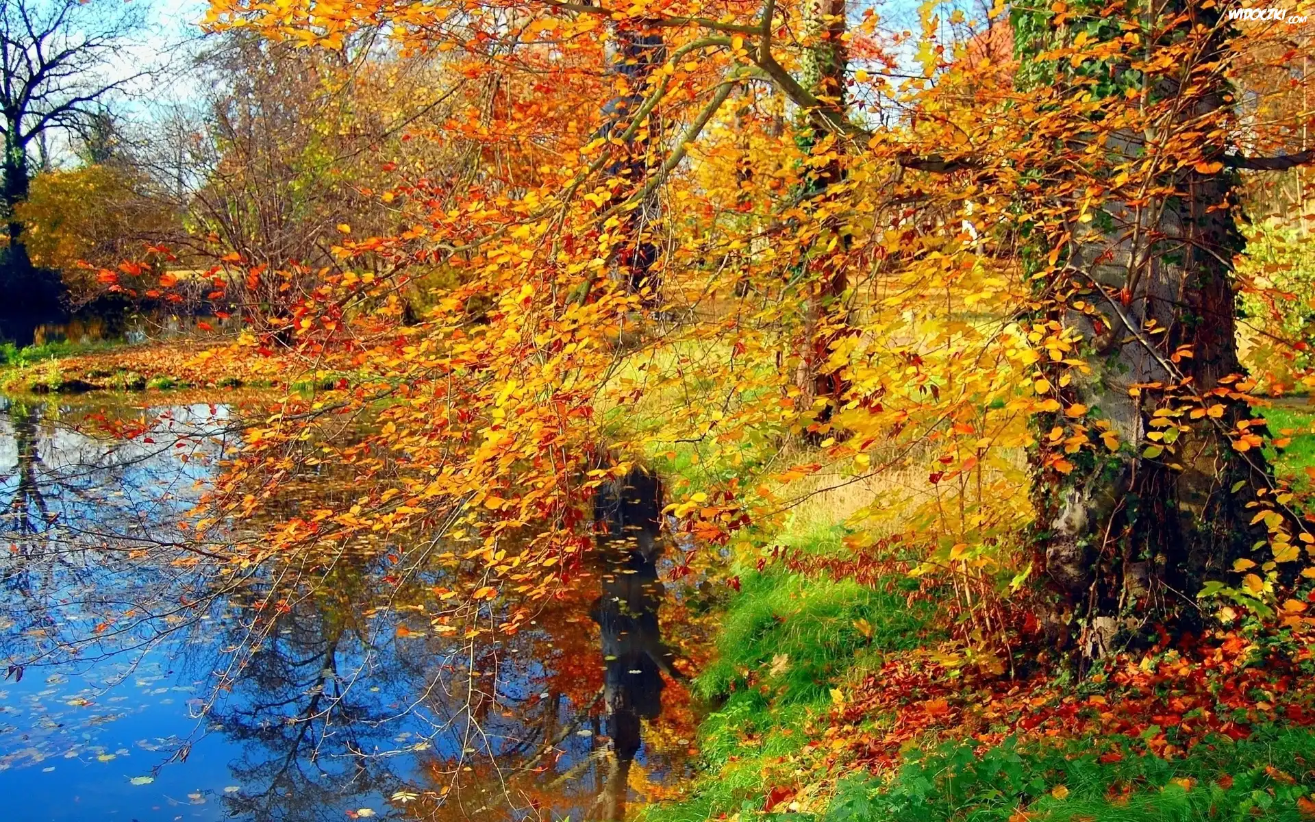 Zdjęcia, Rzeka, Park, Drzewa, Liście, Jesień