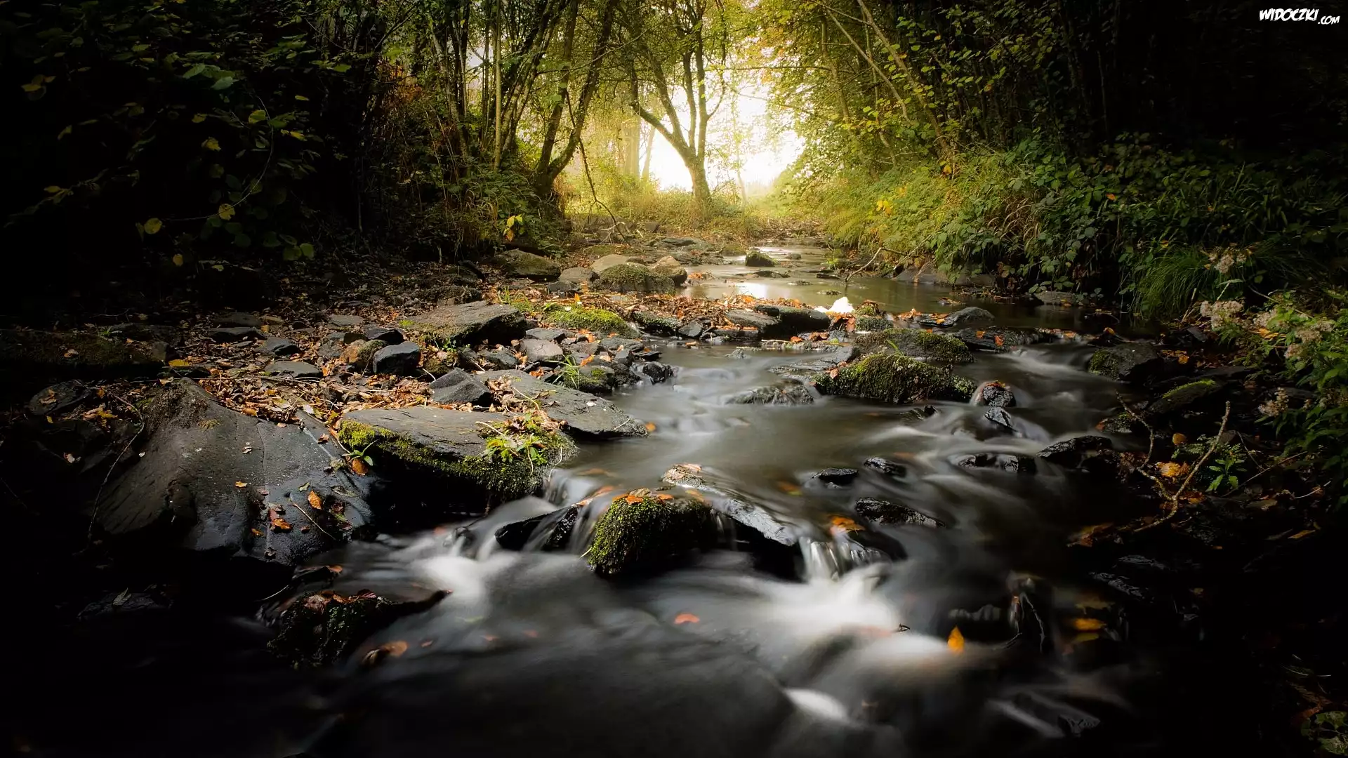 Zdjęcia, Rzeka, Strumyk, Las, Kamienie, Liście, Drzewa