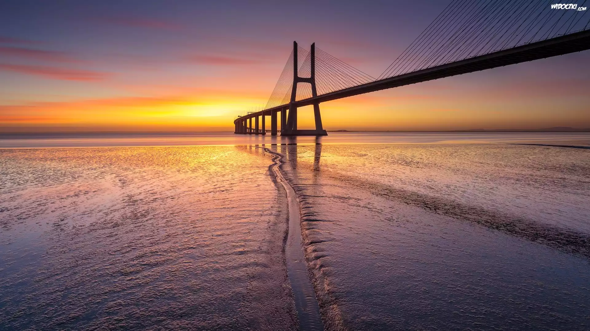 Rzeka, Tag, Zachód słońca, Most Vasco da Gama, Lizbona, Portugalia