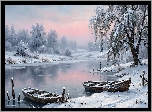 Zima, Dwie, Łódki, Rzeka, Drzewa, Grafika AI