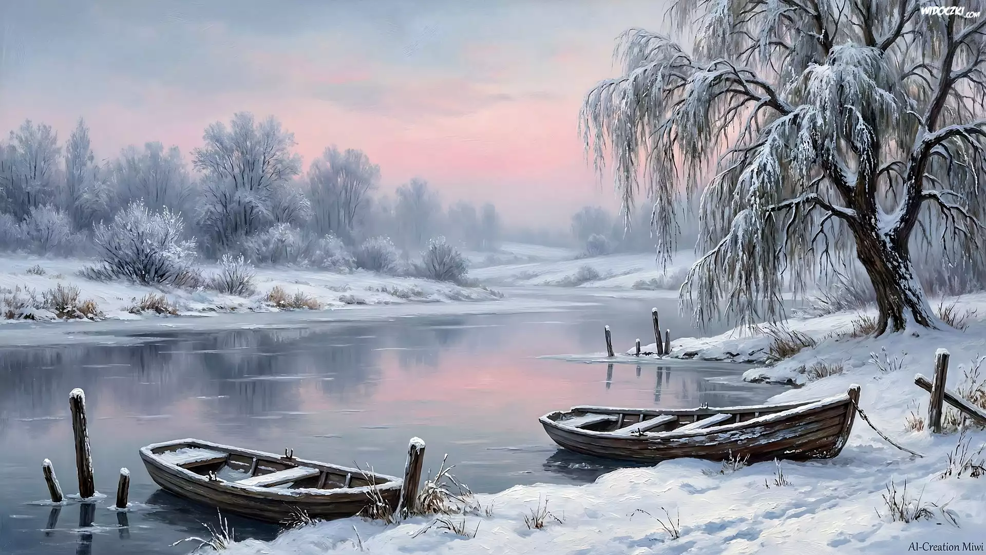 Zdjęcia, Zima, Dwie, Łódki, Rzeka, Drzewa, Grafika AI