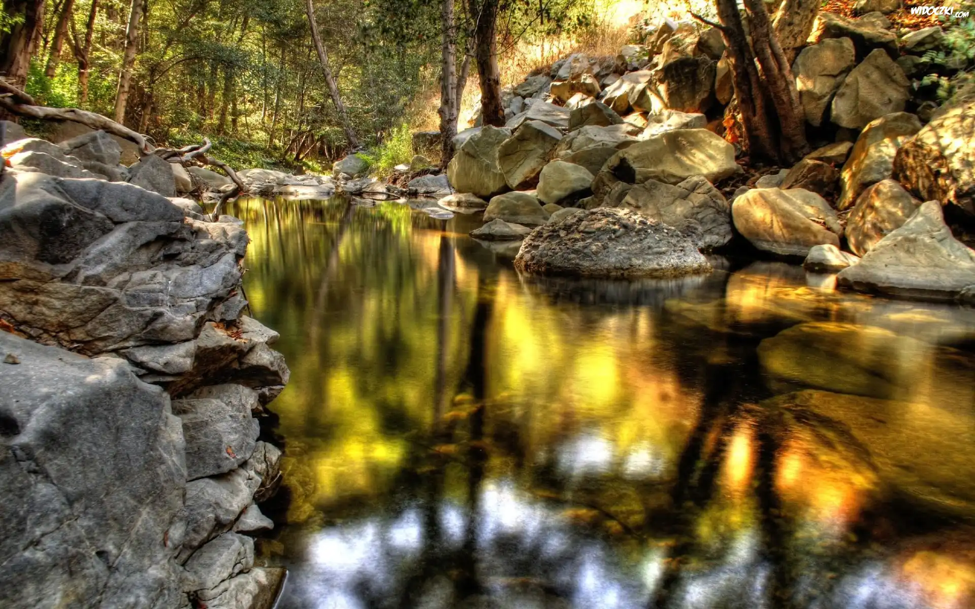Zdjęcia, Rzeka, Kamienie, Las, Lustrzane, Odbicie
