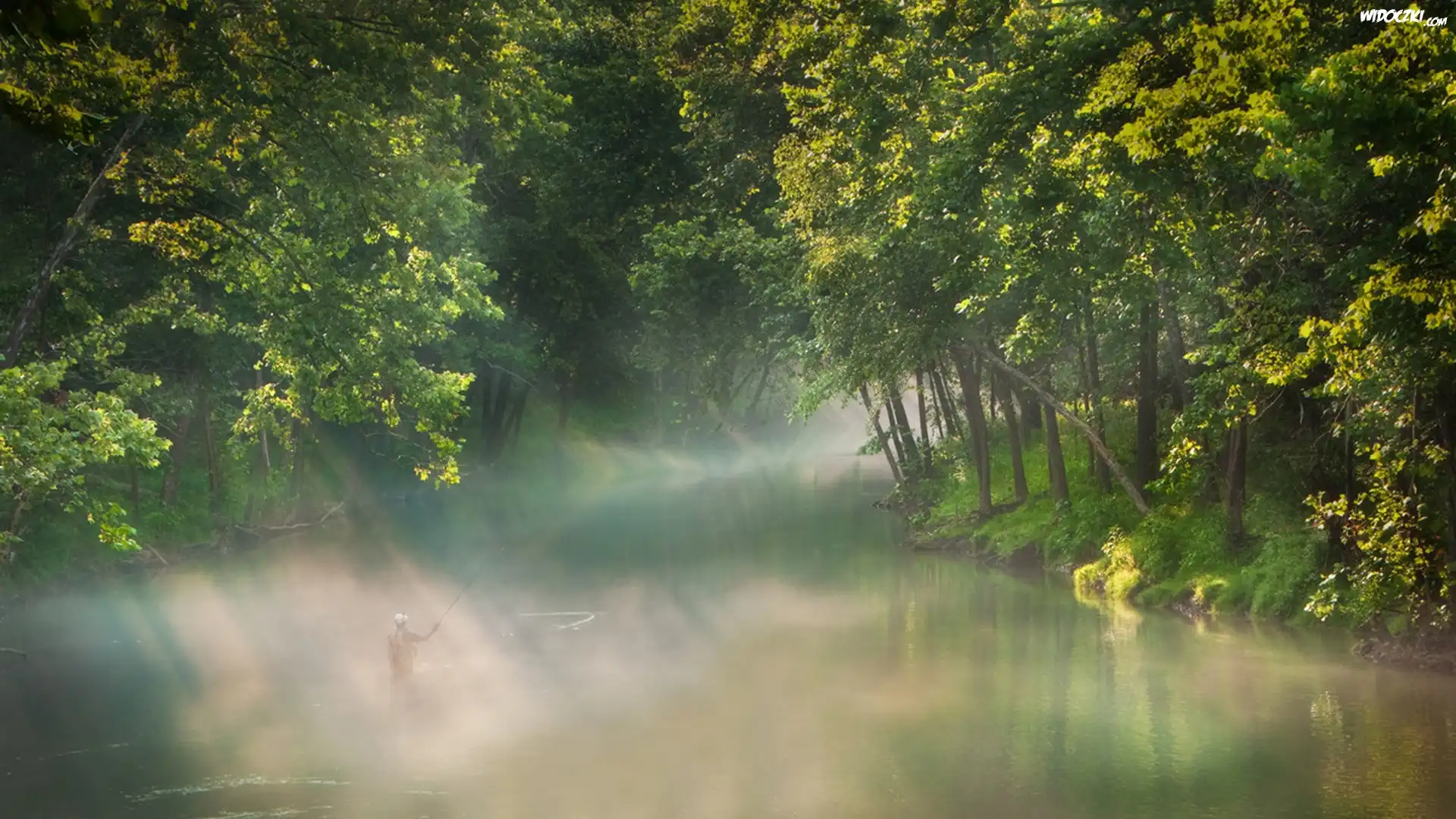 Zdjęcia, Rzeka, Wędkarz, Poranna, Mgła, Drzewa