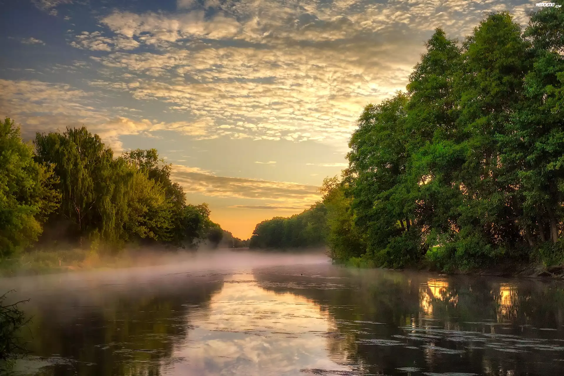 Zdjęcia, Rzeka, Zachód, Słońca, Mgła, Drzewa