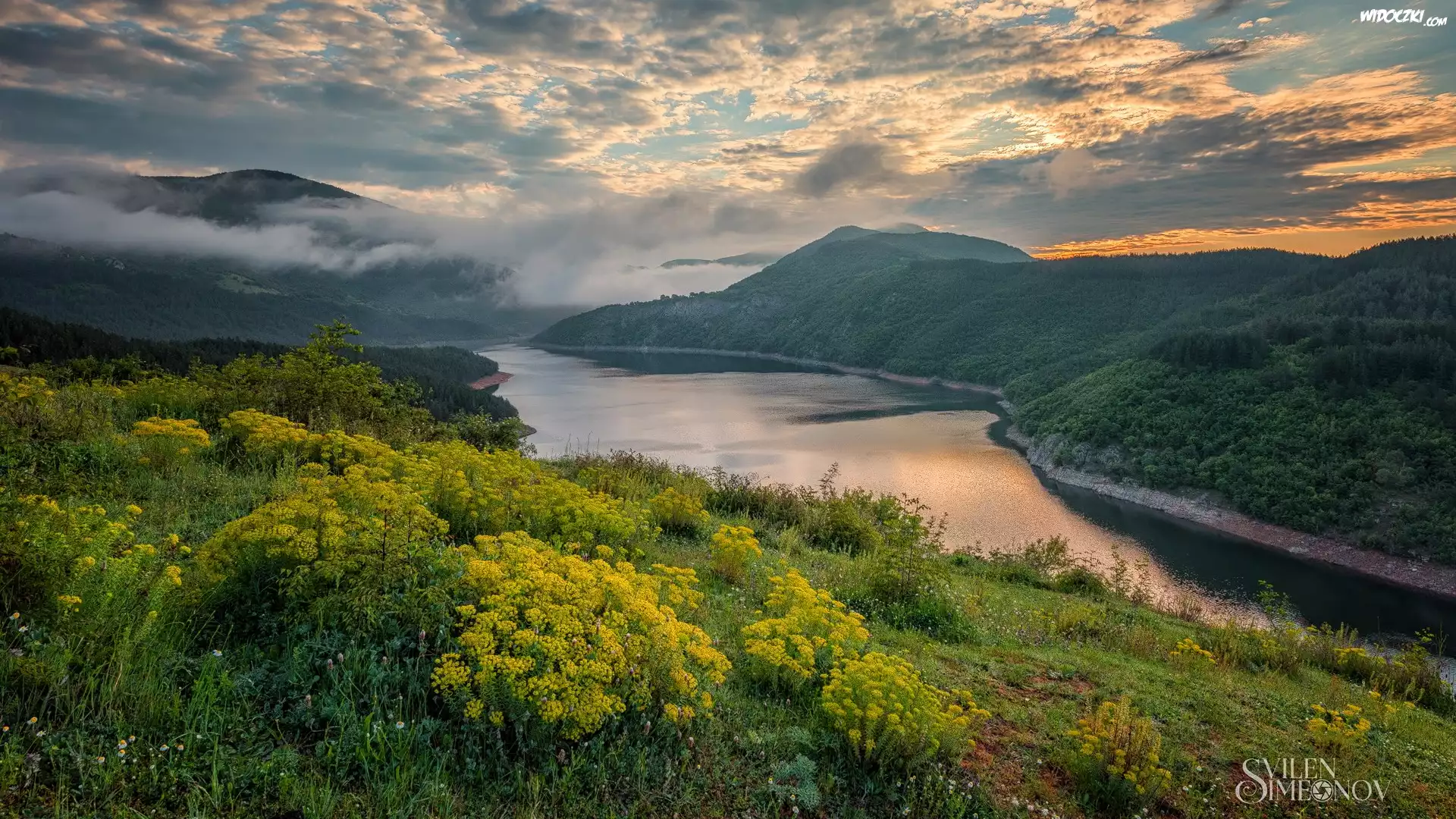 Zdjęcia, Rzeka, Góry, Wzgórza, Mgła, Kwiaty