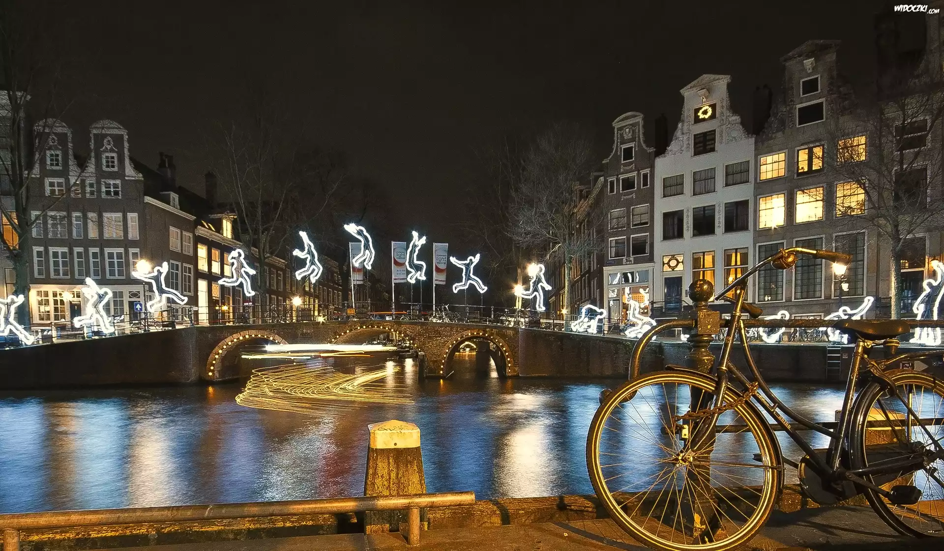 Zdjęcia, Miasto, Rzeka, Rower, Budynki, Most, Neony, Amsterdam