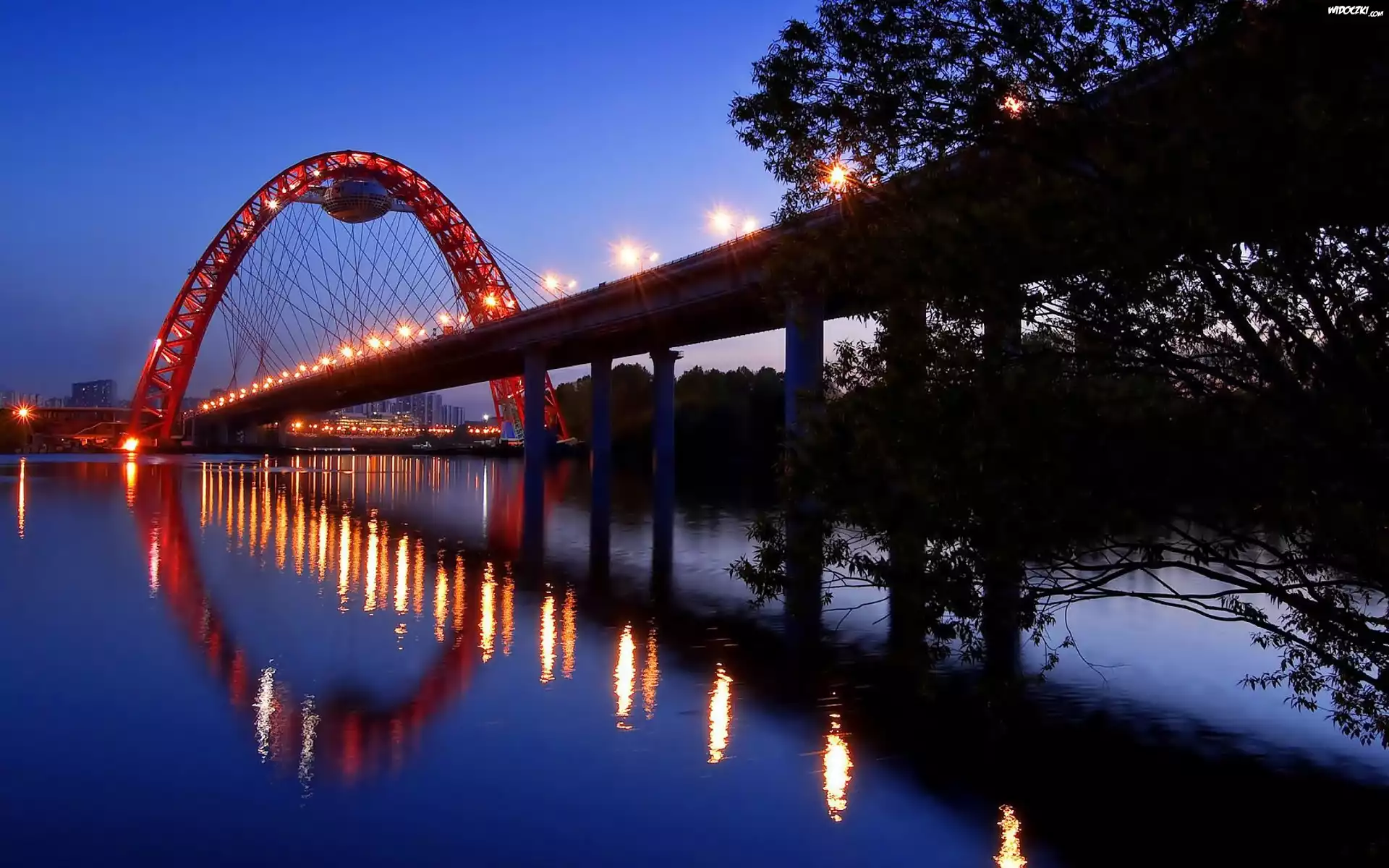 Rzeka, Oświetlony, Most, Moskwa, Nocą