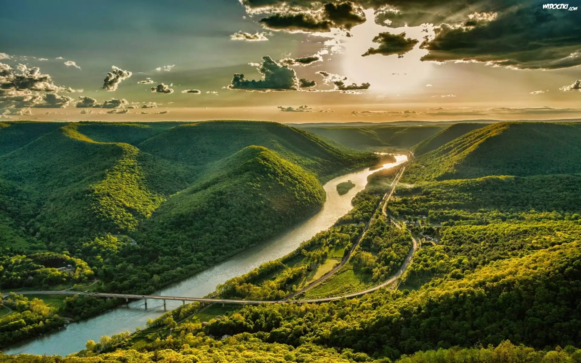 Zdjęcia, Rzeka, Las, Droga, Most, Wzgórza