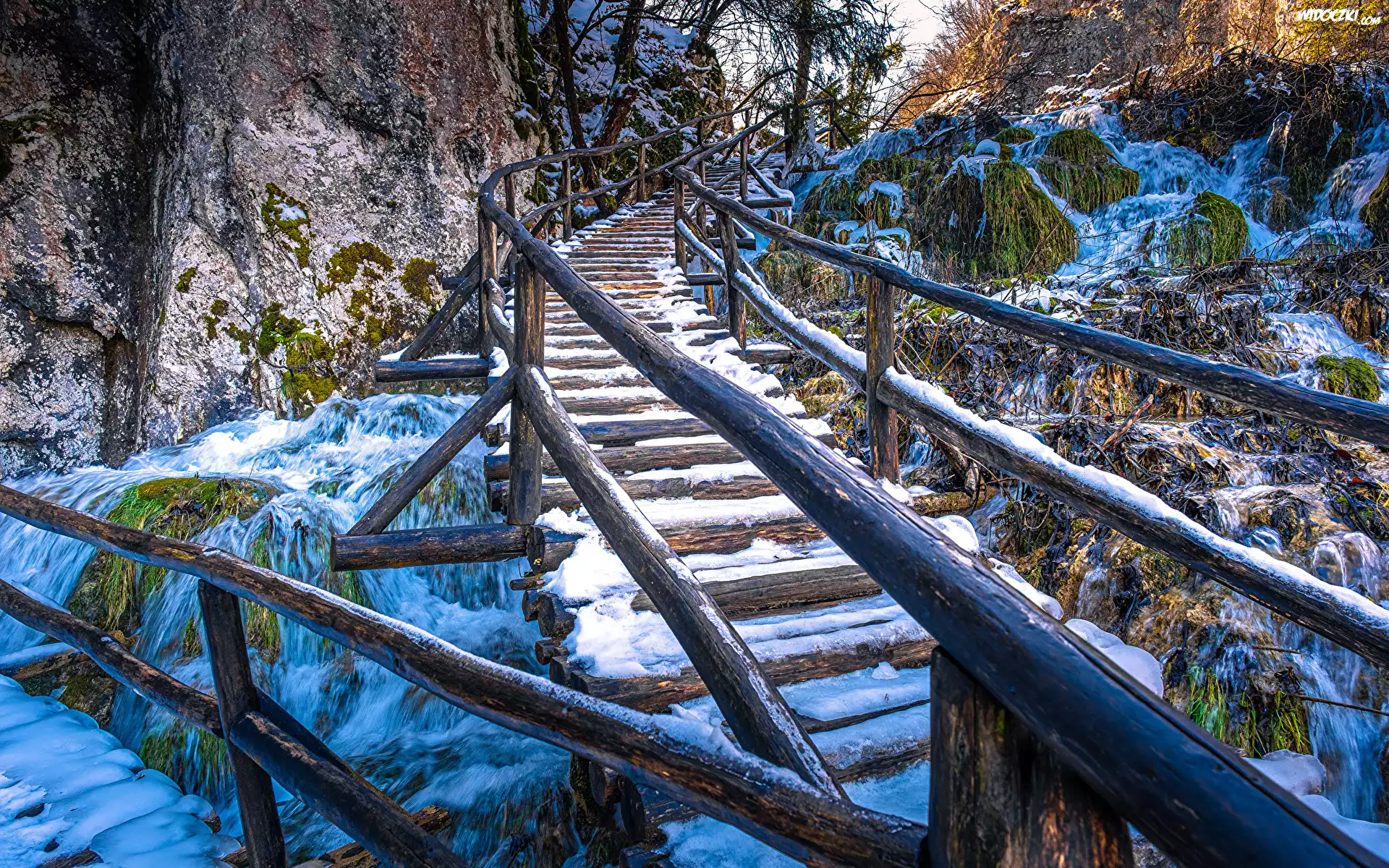 Zdjęcia, Ośnieżone, Skały, Most, Rzeka, Wodospad, Drewniane, Schody