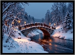 Zima, Śnieg, Most, Rzeka, Latarnie, Ośnieżone, Drzewa