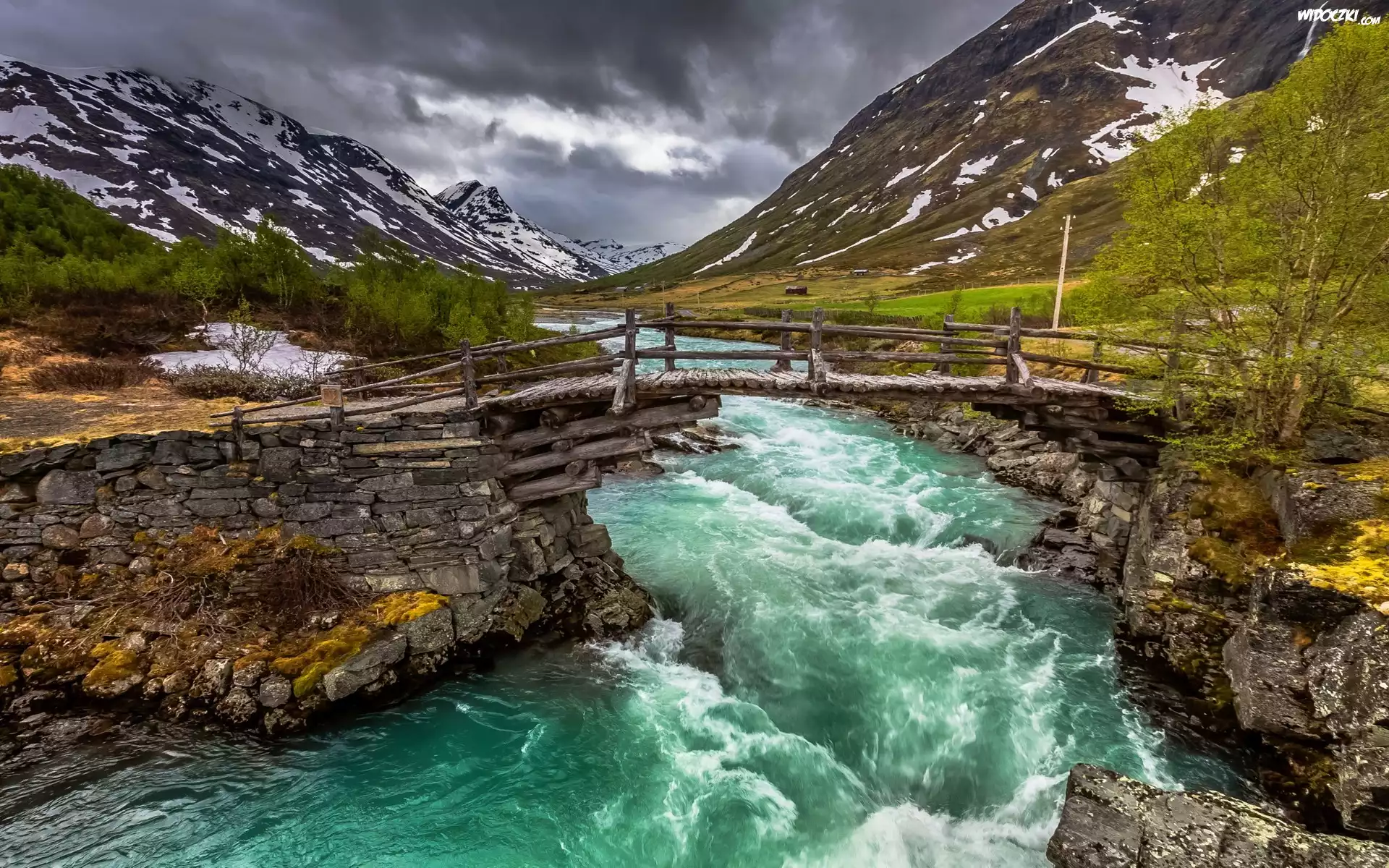Zdjęcia, Rzeka, Góry, Drewniany, Mostek, Chmury