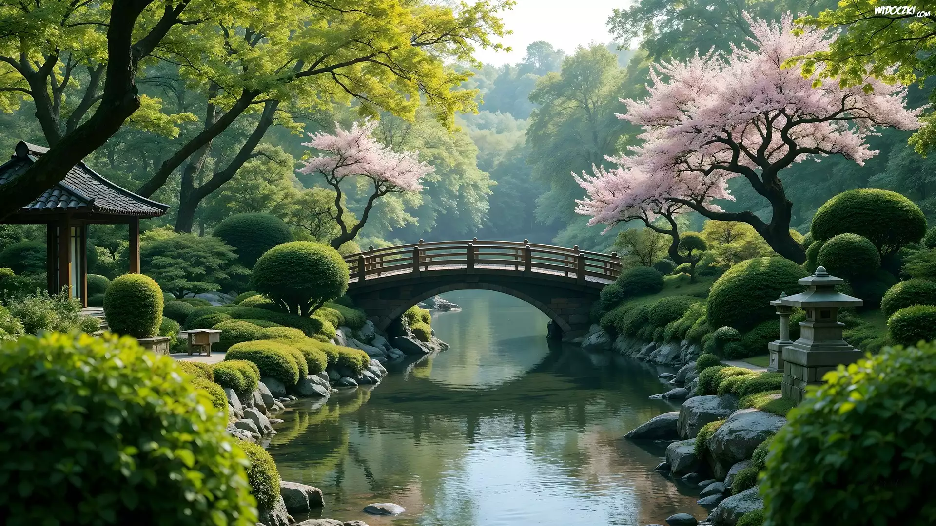 Ogród, Rzeka, Mostek, Drzewa, Krzewy